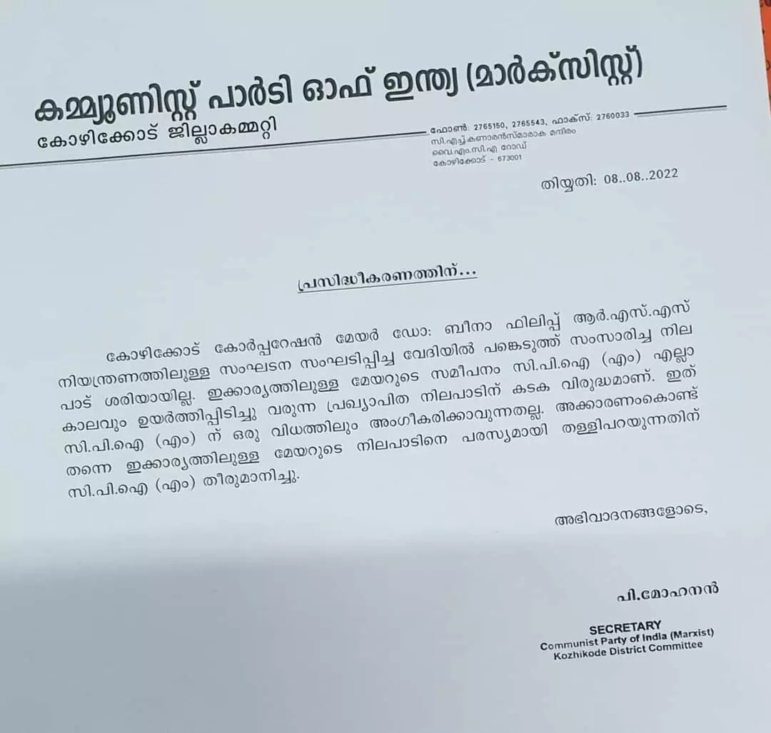 കോഴിക്കോട് കോര്പ്പറേഷന് മേയര് ഡോ.ബീന ഫിലിപ്പ് ആര്.എസ്.എസ് നിയന്ത്രണത്തിലുള്ള സംഘടന സംഘടിപ്പിച്ച വേദിയില് പങ്കെടുത്ത് സംസാരിച്ച നിലപാട് ശരിയായില്ല. ഇക്കാര്യത്തിലുള്ള മേയറുടെ സമീപനം സി.പി.എം എല്ലാക്കാലവും ഉയര്ത്തിപ്പിടിച്ചുവരുന്ന പ്രഖ്യാപിത നിലപാടിന് കടകവിരുദ്ധമാണ്. ഇത് സി.പി.എമ്മിന് ഒരു വിധത്തിലും അംഗീകരിക്കാവുന്നതല്ല. അക്കാരണം കൊണ്ടുതന്നെ ഇക്കാര്യത്തിലുള്ള മേയറുടെ നിലപാടിനെ പരസ്യമായി തള്ളിപ്പറയുന്നതിന് സി.പി.എം തീരുമാനിച്ചു.