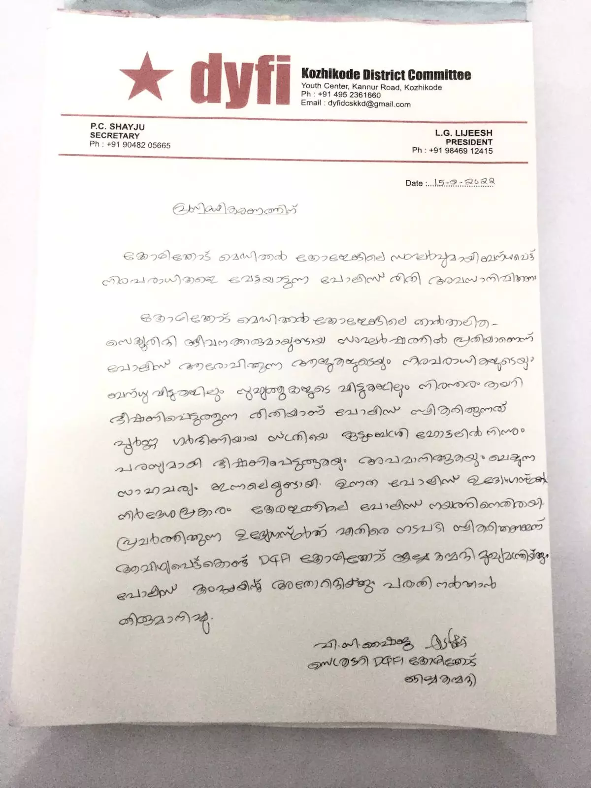 |കേസിൽ ഡി.വൈ.എഫ്.ഐയും പൊലീസിനെതിരെ വിമർശനമുന്നയിച്ചു