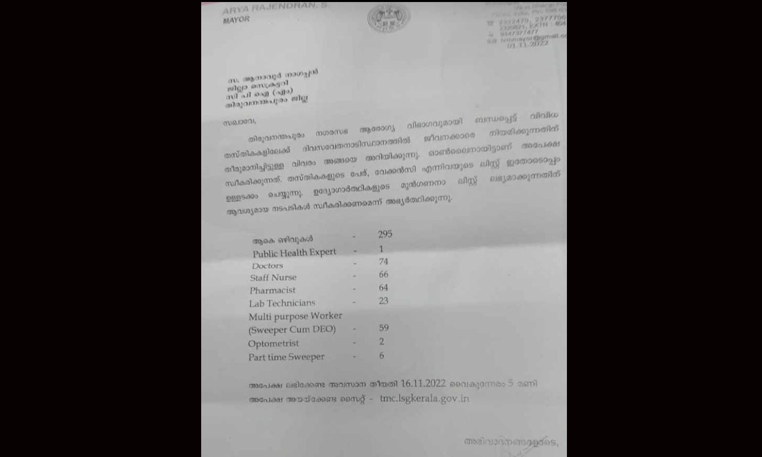 |95 ഒഴിവുകൾ ഉണ്ടെന്ന് കാട്ടിയാണ് മേയർ ആര്യാ രാജേന്ദ്രൻ സിപിഎം ജില്ലാ സെക്രട്ടറിക്ക് കത്തയച്ചത്