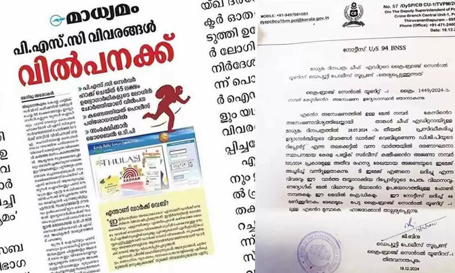 പിഎസ്സിയുടെ ഔദ്യോഗിക രേഖ എങ്ങനെ ലഭിച്ചുവെന്ന് വിശദീകരിക്കാൻ നിർദേശിച്ച് ക്രൈംബ്രാഞ്ച് മാധ്യമം ചീഫ് എഡിറ്റർക്കും നോട്ടീസ് അയച്ചിട്ടുണ്ട്. ഉദ്യോഗാർഥികളുടെ യൂസർ ഐഡി അടക്കം ചോർന്നത് മാധ്യമം പുറത്തുകൊണ്ടുവന്നിരുന്നു. വിവരങ്ങൾ ചോർത്തി സൈബർ ഹാക്കർമാർ ഡാർക്ക് വെബിൽ വിൽപനയ്ക്കു വച്ചുവെന്നായിരുന്നു റിപ്പോർട്ട്. ഇതിലാണ് വാർത്ത ചോർന്ന വഴി കണ്ടെത്താൻ ക്രൈംബ്രാഞ്ച് അന്വേഷണം നടക്കുന്നത്.