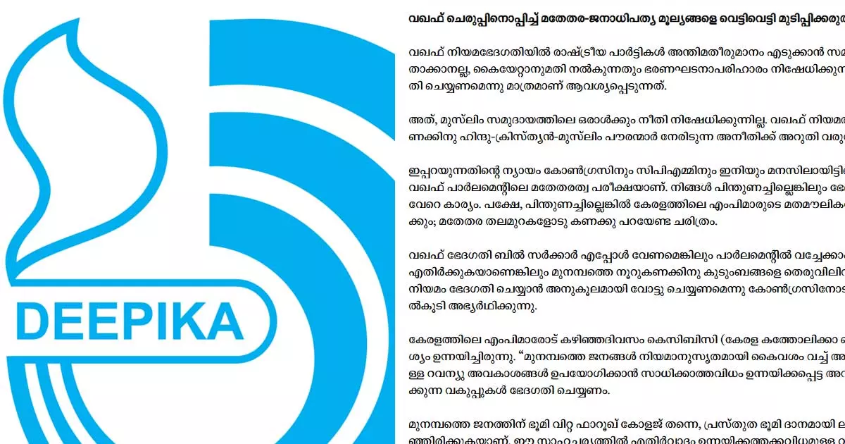 'വഖഫ് ബിൽ പാർലമെന്റിലെ മതേതരത്വ പരീക്ഷ'; ഭേദഗതിയെ അനുകൂലിച്ച് ദീപിക മുഖപ്രസംഗം