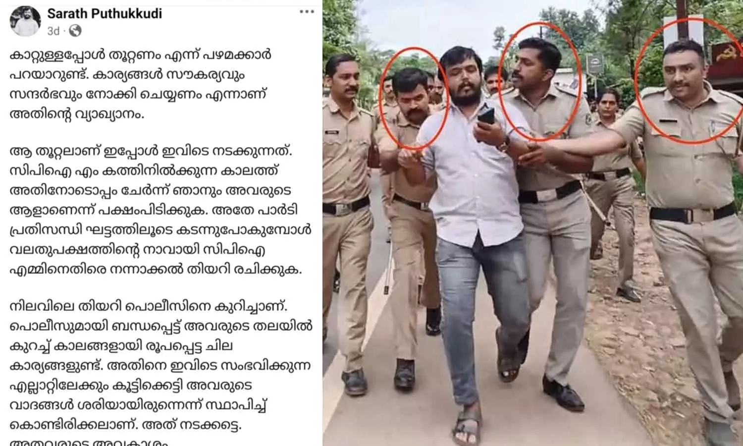 രണ്ട് ദിവസം മുമ്പാണ് ശരത്ത് പൊലീസിനെതിരായ വിമർശനങ്ങൾ ഗൂഢാലോചനയാണെന്ന് ചൂണ്ടിക്കാട്ടി ഫേസ്ബുക്ക് പോസ്റ്റിട്ടത്. സിപിഎം കത്തിനിൽക്കുന്ന കാലത്ത് അതിനൊപ്പം ചേർന്ന് ഞാനും അവരുടെ ആളാണെന്ന് പക്ഷം പിടിക്കുക. അതേ പാർട്ടി പ്രതിസന്ധി നേരിടുമ്പോൾ വലതുപക്ഷത്തിന്റെ നാവായി സിപിഎമ്മിനെതിരെ നന്നാക്കൽ തിയറി രചിക്കുക. നിലവിലെ തിയറി പൊലീസിനെ കുറിച്ചാണ് പൊലീസുമായി ബന്ധപ്പെട്ട് അവരുടെ തലയിൽ കുറച്ചുകാലങ്ങളായി രൂപപ്പെട്ട ചില കാര്യങ്ങളുണ്ട്. അതിനെ ഇവിടെ സംഭവിക്കുന്ന എല്ലാത്തിലേക്കും കൂട്ടിക്കെട്ടി അവരുടെ വാദങ്ങൾ ശരിയായിരുന്നുവെന്ന് സ്ഥാപിച്ചുകൊണ്ടിരിക്കലാണെന്നും ശരത്ത് ഫേസ്ബുക്ക് പോസ്റ്റിൽ പറഞ്ഞിരുന്നു.