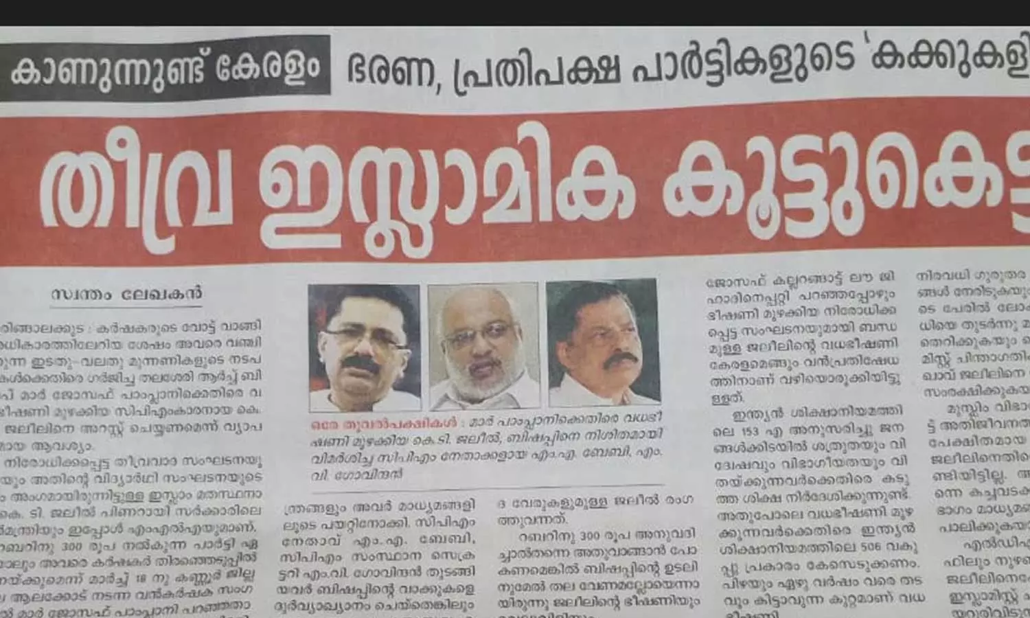 തലശ്ശേരി രൂപത ആർച്ച് ബിഷപ്പ് പാംപ്ലാനിക്കെതിരെ വധഭീഷണി മുഴക്കിയ ജലീലിനെ അറസ്റ്റ് ചെയ്യണം.പിഴയും ഏഴുവർഷം വരെ തടവും കിട്ടാവുന്ന കുറ്റത്തിന് കേസെടുക്കണമെന്നും ലേഖനം ആവശ്യപ്പെട്ടു.