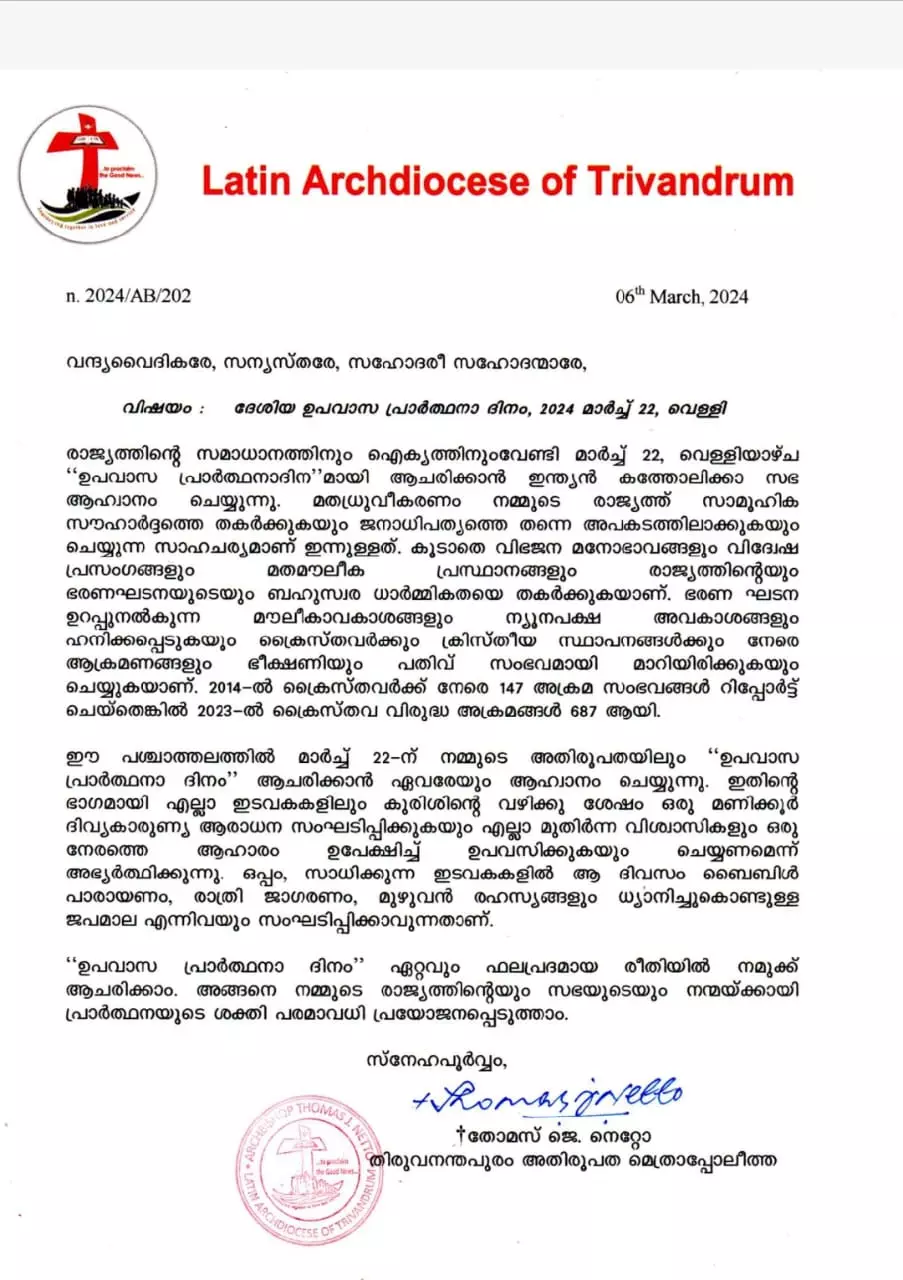മാർച്ച് 22ന് പ്രാർത്ഥനാ ദിനമായി ആചരിക്കുമെന്ന് ലത്തീൻ രൂപത