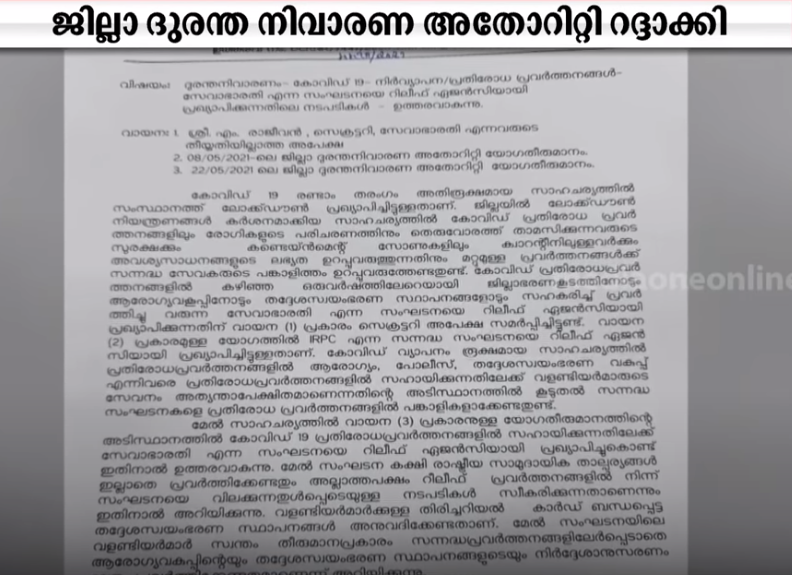 സേവാഭാരതിയെ കോവിഡ് റിലീഫ് ഏജന്സിയായി നിയോഗിച്ച തീരുമാനം ജില്ല ദുരന്തനിവാരണ അതോറിറ്റി റദ്ദ് ചെയ്തു