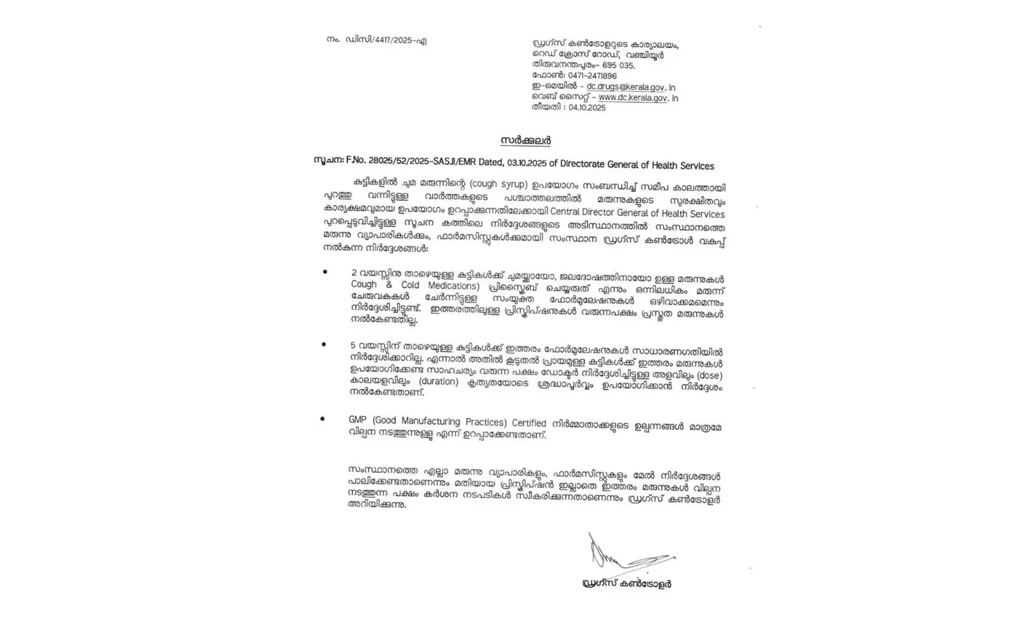 '2 വയസിൽ താഴെയുള്ള കുട്ടികൾക്ക് കഫ് സിറപ്പ് നൽകരുത്, ഡോക്ടറുടെ കുറിപ്പടിയില്ലാതെ വിൽക്കരുത്': സർക്കുലറുമായി ഡ്രഗ്സ് കൺട്രോളർ