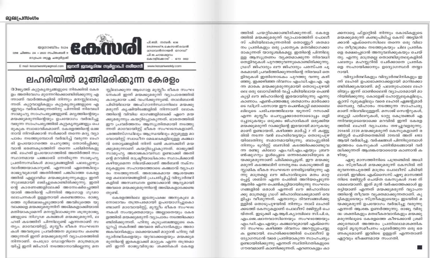 അരാജകമായ ആശയങ്ങൾ കാമ്പസുകളിൽ പ്രചരിപ്പിച്ച് വിദ്യാർഥികളിൽ അസ്വസ്ഥതയുണ്ടാക്കാൻ അവരെ മയക്കുമരുന്നിന് അടിമകളാക്കേണ്ടതുണ്ട്. കേരളത്തിലെ ഇടതുപക്ഷ അനുകൂല മനോഭാവം തന്ത്രപരമായി ഉപയോഗിച്ചുകൊണ്ടാണ് മാവോയിസ്റ്റ്, മുസ്ലിം ഭീകരസംഘടനകൾ സംയുക്തമായും അല്ലാതെയും കേരളത്തിൽ മയക്കുമരുന്ന് വ്യാപാരം നടത്തുന്നതെന്നും മുഖപ്രസംഗം പറയുന്നു.