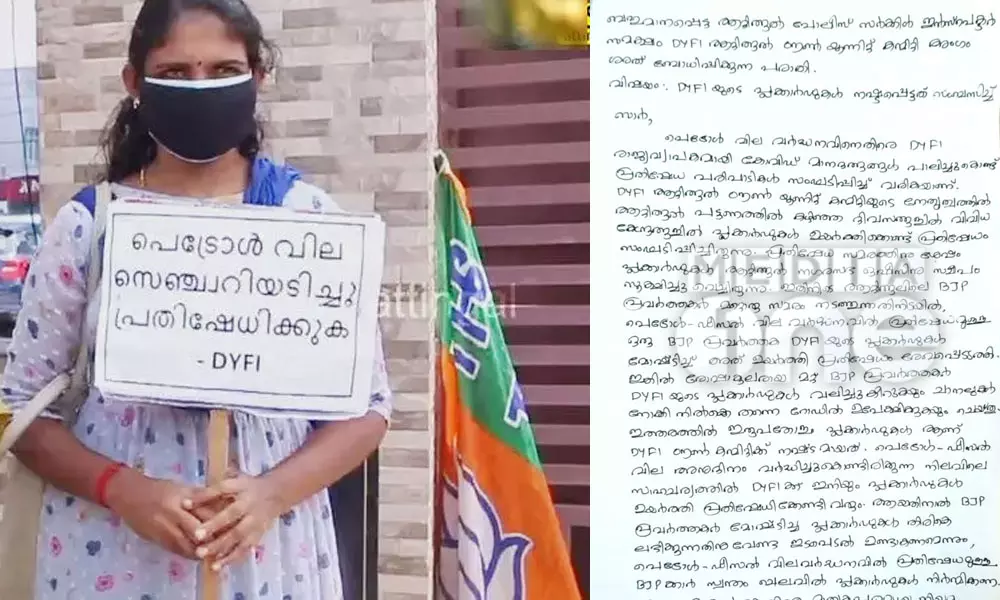 'ബി.ജെ.പി പ്രതിഷേധത്തിലെ ഡി.വൈ.എഫ്.ഐ പ്ലക്കാര്ഡ് മോഷ്ടിച്ചത്': പൊലീസില് പരാതി
