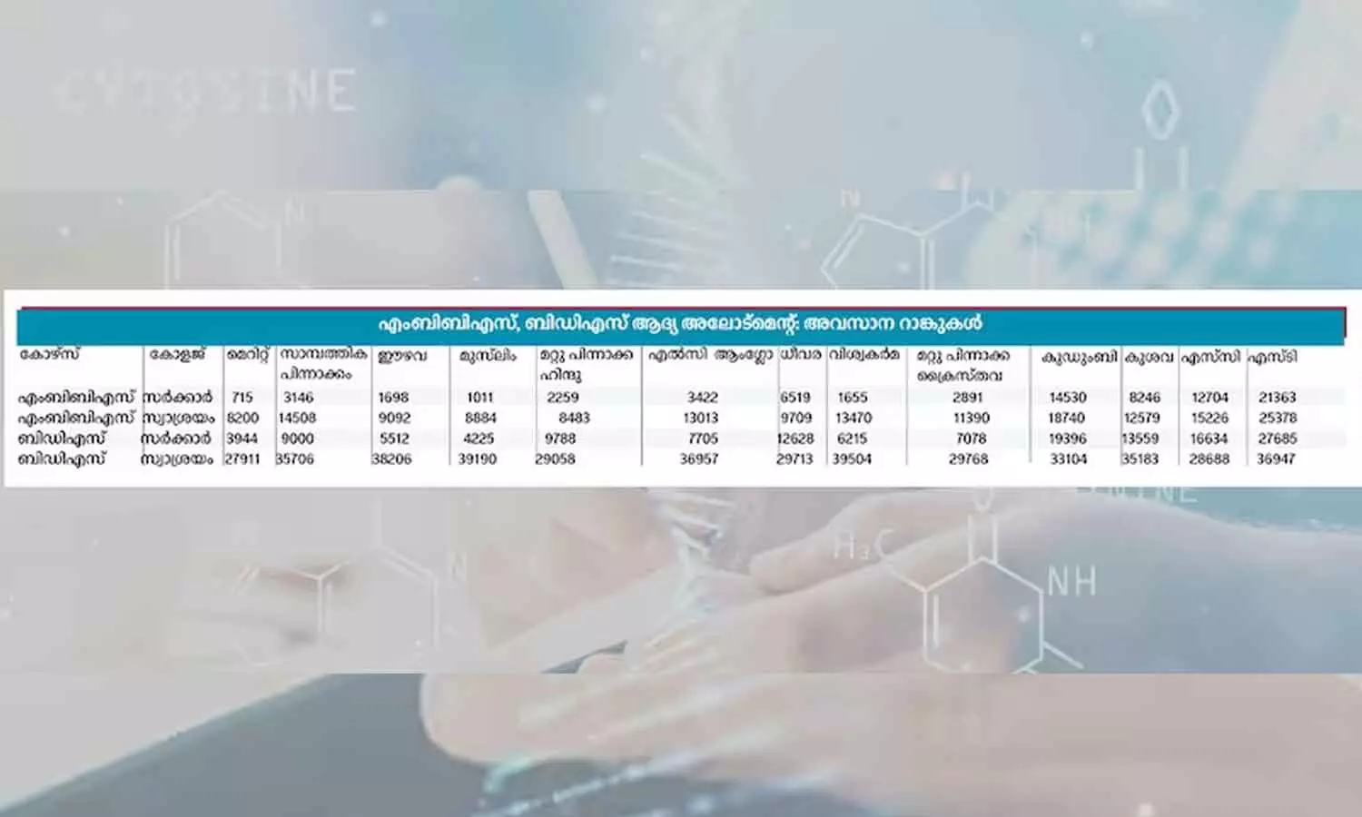 സ്വാശ്രയ വിഭാഗത്തിൽ ഈഴവ വിഭാഗത്തിലെ അവസാന റാങ്ക് 9092ഉം മുസ്ലിം വിഭാഗത്തിൽ 8884ഉം ആണ്. എന്നാൽ സാമ്പത്തിക സംവരണം വഴി അഡ്മിഷൻ നേടിയ അവസാന റാങ്ക് 14508 ആണ്. ബി.ഡി.എസിൽ സർക്കാർ കോളജുകളിൽ പ്രവേശനം നേടിയ ഈഴവ വിഭാഗത്തിലെ അവസാന റാങ്ക് 5512ഉം മുസ്ലിം വിഭാഗത്തിൽ 4225ഉം ആണ്. എന്നാൽ സാമ്പത്തിക സംവരണം വഴി പ്രവേശനം നേടിയ അവസാന റാങ്ക് 9000 ആണ്. ബി.ഡി.എസ് സ്വാശ്രയ കോളജുകളിൽ അവസാനം പ്രവേശനം നേടിയ റാങ്ക് ഈഴവ വിഭാഗത്തിൽ 38206ഉം 39190ഉം ആണ്. എന്നാൽ സാമ്പത്തിക സംവരണം വഴി പ്രവേശനം നേടിയ അവസാന റാങ്ക് 35706 ആണ്.