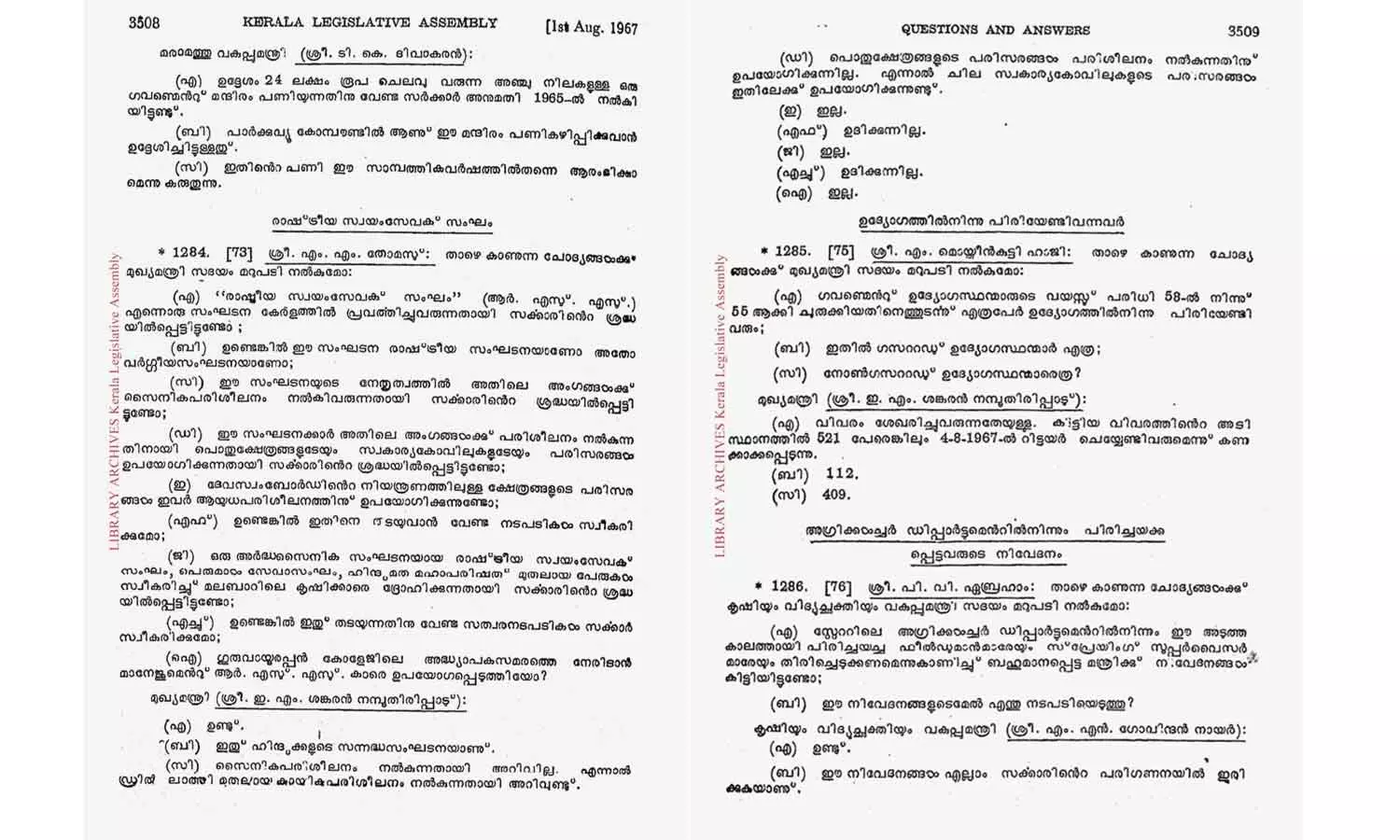 എം.എം തോമസിന്റെ ചോദ്യത്തിനാണ് 1967 ആഗസ്റ്റ് ഒന്നിന് മുഖ്യമന്ത്രിയായിരുന്ന ഇഎംഎസ് മറുപടി നൽകിയത്.