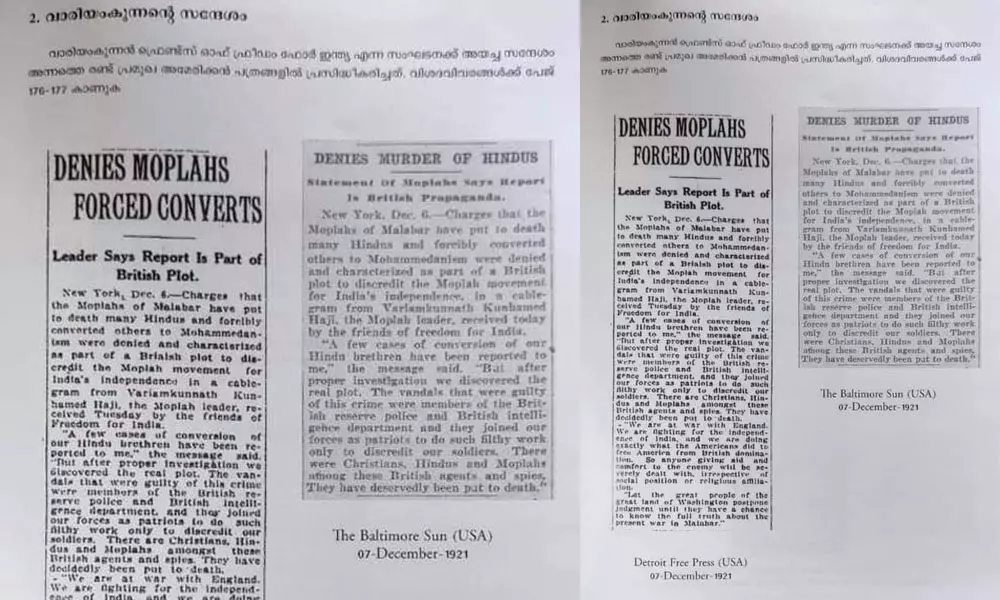 1921 ൽ വാരിയംകുന്നത് കുഞ്ഞഹമ്മദ് ഹാജി ഫ്രണ്ട്സ് ഓഫ് ഫ്രീഡം ഓഫ് അമേരിക്ക എന്ന അമേരിക്കൻ സംഘടനക്ക് അയച്ച കത്തിലാണ് നിർബന്ധിത മതപരിവർത്തങ്ങൾക്ക് പിന്നിൽ ബ്രിട്ടീഷ് ചാരന്മാർ ആണെന്ന് പറയുന്നത്. അന്നത്തെ രണ്ട് പ്രമുഖ അമേരിക്കൻ ദിനപത്രങ്ങളിൽ പ്രസിദ്ധീകരിച്ച കത്തിന്റെ പകർപ്പ് പുസ്തകത്തിലുണ്ട്.