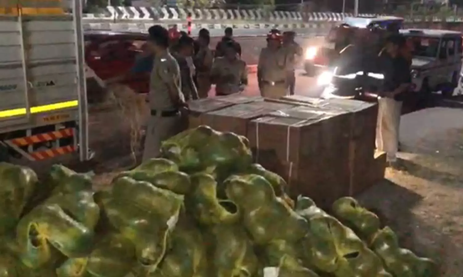 ലോറിയിലുണ്ടായിരുന്ന തണ്ണിമത്തൻ ചാക്കുകൾക്കിടയിലെ പെട്ടികളിൽ നിന്നാണ് സ്ഫോടകശേഖരം പിടികൂടിയത്