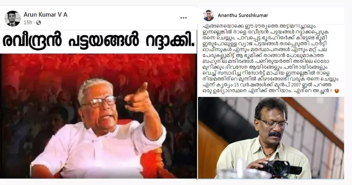 രവീന്ദ്രൻ പട്ടയങ്ങൾ റദ്ദാക്കാൻ നിലവിലെ സർക്കാർ തീരുമാനമെടുത്തതോടെ അന്നത്തെ തീരുമാനങ്ങൾ ശരിയാണെന്ന് സ്ഥാപിക്കാൻ ശ്രമിക്കുകയാണ് അക്കാലത്തെ മുഖ്യമന്ത്രി വി എസ് അച്യുതാനന്ദന്റെ മകനും മൂന്നാർ ദൗത്യത്തിന് നേതൃത്വം നൽകിയ സുരേഷ് കുമാറിന്റെ മകൻ അനന്ദുവും. അനധികൃതമായി നേടിയ ഭൂമി ഇന്നല്ലെങ്കിൽ നാളെ സർക്കാർ ഏറ്റെടുക്കുമെന്ന സുരേഷ് കുമാറിന്റെ പഴയ വാചകങ്ങൾ ഉദ്ധരിച്ചായിരുന്നു അനന്ദു സുരേഷ് കുമാറിന്റെ ഫേസ് ബുക്ക് പോസ്റ്റ്. വി.എസിന്റെ ചിത്രവും രവീന്ദ്രൻ പട്ടയം റദ്ദാക്കിയതിന്റെ വാർത്തയും ചേർത്തായിരുന്നു വി.എസിന്റെ മകൻ അരുൺ കുമാറിന്റെ ഫേസ് ബുക്ക് പോസ്റ്റ്. ഇരുവരുടെയും പോസ്റ്റിന് നിരവധി പേർ അഭിവാദ്യം അർപ്പിച്ചു.