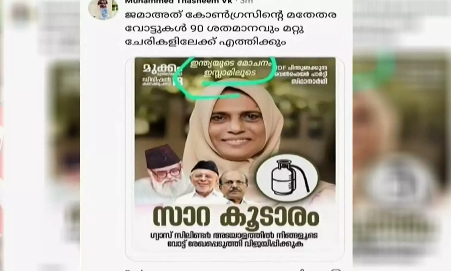 |കഴിഞ്ഞ തെരഞ്ഞെടുപ്പിൽ മുക്കം നഗരസഭയിൽ 18ാം വാർഡിൽ മത്സരിച്ച വെൽഫെയർ പാർട്ടി സ്ഥാനാർഥി സാറാ കൂടാരത്തിനെതിരെയാണ് വ്യാജ പോസ്റ്റർ പ്രചാരണം