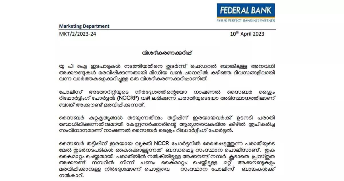 യു.പി.ഐ ഉപയോഗിച്ച് ഇടപാടുകള് നടത്തിയ അക്കൌണ്ടുകള് മാത്രമല്ല നെഫ്റ്റ്, ആര്.ടി.ജി.എസ്, അക്കൌണ്ട് ട്രാന്സ്ഫര്, ചെക്ക് തുടങ്ങിയ ഉപയോഗിച്ച് ഇടപാടുകള് നടത്തിയ അക്കൌണ്ടുകളും മരവിപ്പിക്കാന് നിര്ദേശം ലഭിക്കാറുണ്ടെന്ന് ഫെഡറല് ബാങ്ക് വ്യക്തമാക്കി. അക്കൌണ്ട് മരവിപ്പിക്കല് നേരിടുന്ന ഇടപാടുകാര്ക്ക് പരാതിയുടെ വിവരങ്ങള് ബാങ്ക് കൈമാറാറുണ്ട്. ബന്ധപ്പെടേണ്ട ഓഫീസിന്റെ ഫോണ്, ഇ മെയില് വിലാസം എന്നിവയും കൈമാറാറുണ്ടെന്ന് ബാങ്ക് വിശദീകരിച്ചു.