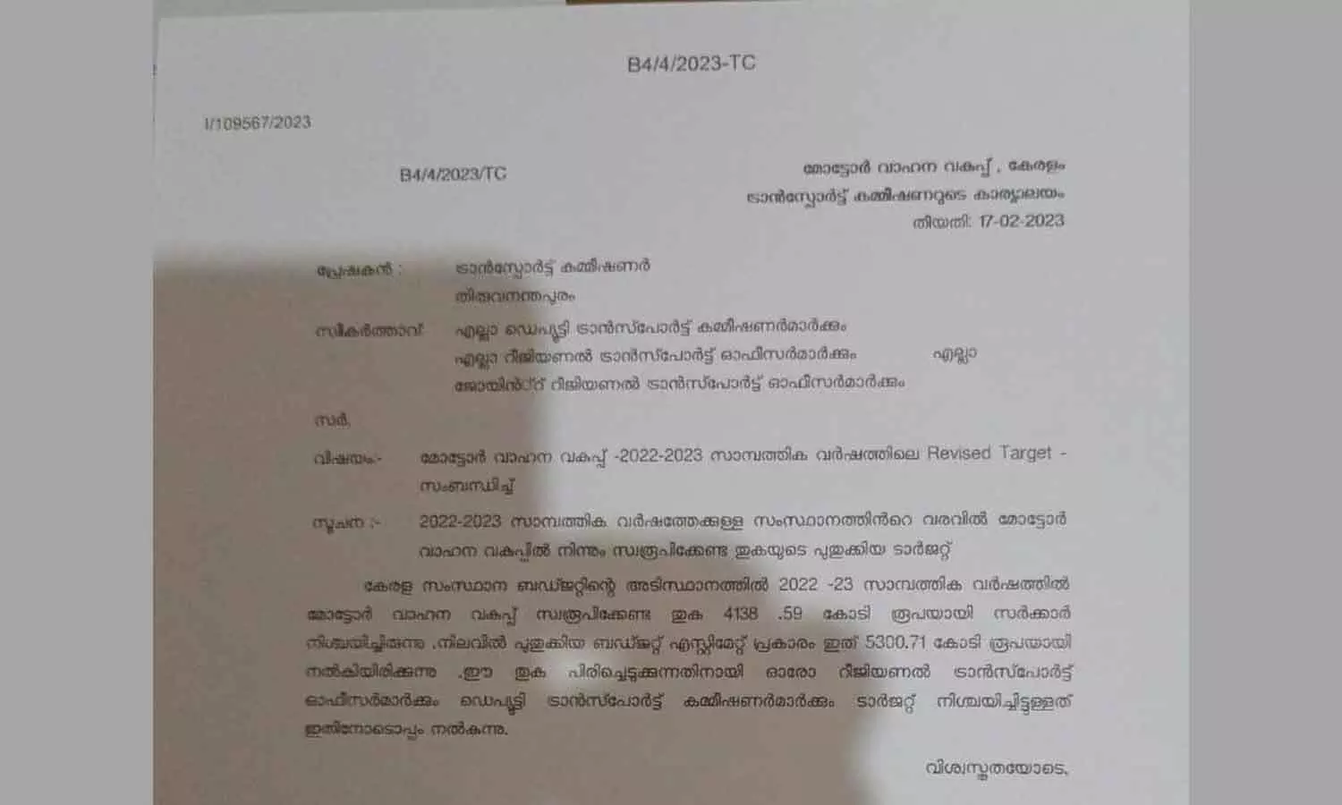 17-02-2023ന് പുറത്തിറക്കിയ സർക്കുലറിലാണ് മോട്ടോർ വാഹന വകുപ്പിന് ടാർജറ്റ് നിർണയിച്ചുനൽകിയത്. 'കേരള സംസ്ഥാന ബഡ്ജറ്റിന്റെ അടിസ്ഥാനത്തിൽ 2022-23 സാമ്പത്തിക വർഷത്തിൽ മോട്ടോർ വാഹന വകുപ്പ് സ്വരൂപിക്കേണ്ട തുക 4138.59 കോടി രൂപയായി സർക്കാർ നിശ്ചയിച്ചിരിക്കുന്നു. നിലവിൽ പുതുക്കിയ ബഡ്ജറ്റ് എസ്റ്റിമേറ്റ് പ്രകാരം ഇത് 5300.71 കോടി രൂപയായി നൽകിയിരിക്കുന്നു. ഈ തുക പിരിച്ചെടുക്കുന്നതിനായി ഓരോ റീജിയണൽ ട്രാൻസ്പോർട്ട് ഓഫീസർമാർക്കും ഡെപ്യൂട്ടി ട്രാൻസ്പോർട്ട് കമ്മീഷണർമാർക്കും ടാർജറ്റ് നിശ്ചയിച്ചിട്ടുള്ളത്'-ഇതാണ് സർക്കുലറിൽ പറയുന്നത്.