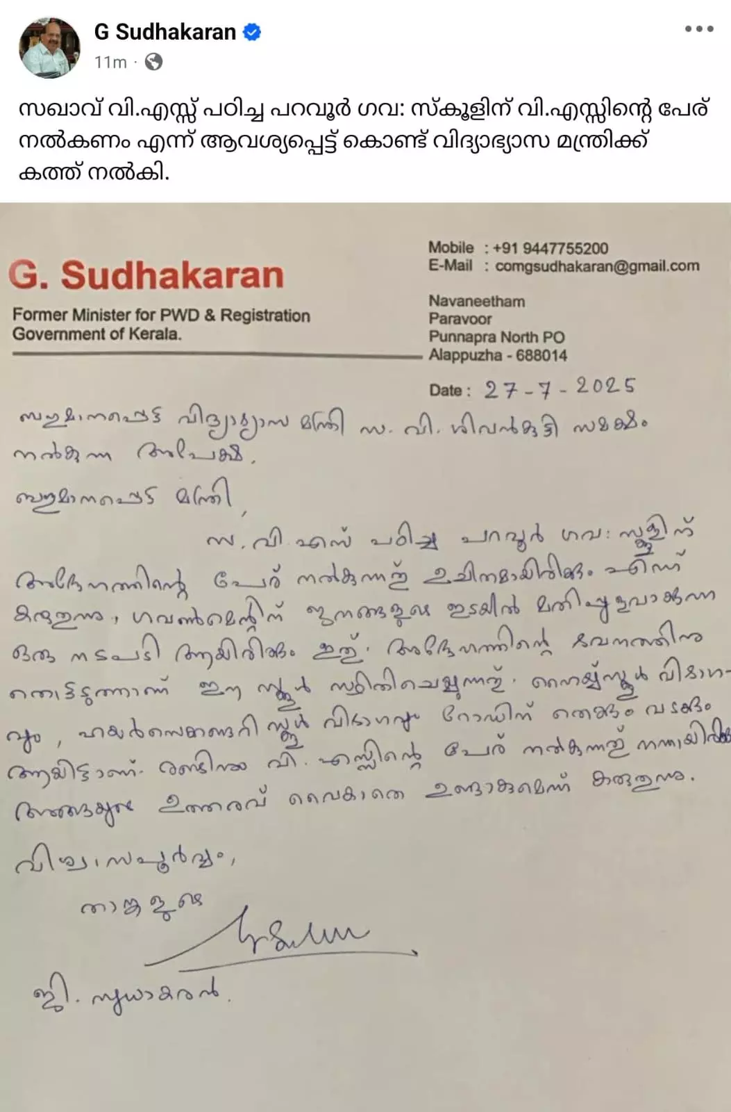 പറവൂർ ഗവ: സ്കൂളിന് വി.എസ്സിന്റെ പേര് നൽകണം എന്ന് ആവശ്യപ്പെട്ട് കൊണ്ടാണ് കത്ത് നൽകിയത്. ഈ മാസം 27 നാണ് കത്ത് നൽകിയത്.കത്ത് ഫേസ്ബുക്കിൽ പങ്കുവെച്ചിട്ടുണ്ട്.