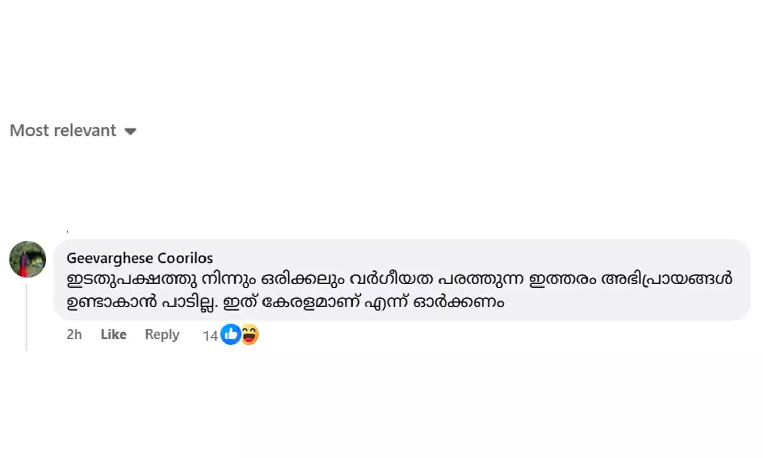 ഇടതുപക്ഷത്ത് നിന്നും ഒരിക്കലും വർഗീയത പരത്തുന്ന അഭിപ്രായങ്ങൾ ഉണ്ടാകാൻ പാടില്ലെന്നും ഇത് കേരളമാണെന്ന് ഓര്ക്കണമെന്നും ഗീവർഗീസ് മാർ കൂറിലോസ് പറഞ്ഞു. എ.കെ ബാലന്റെ പ്രസ്താവനകളെ തള്ളിയുള്ളൊരു ഫേസ്ബുക്ക് പോസ്റ്റിന് കമന്റായാണ് ഗീവർഗീസ് മാർ കൂറിലോസ് ഇക്കാര്യം രേഖപ്പെടുത്തിയത്. ചൊവ്വാഴ്ച പാലക്കാട്ട് മാധ്യമപ്രവര്ത്തകരോട് സംസാരിക്കവെയായിരുന്നു എ.കെ ബാലന്റെ പ്രസ്താവന.