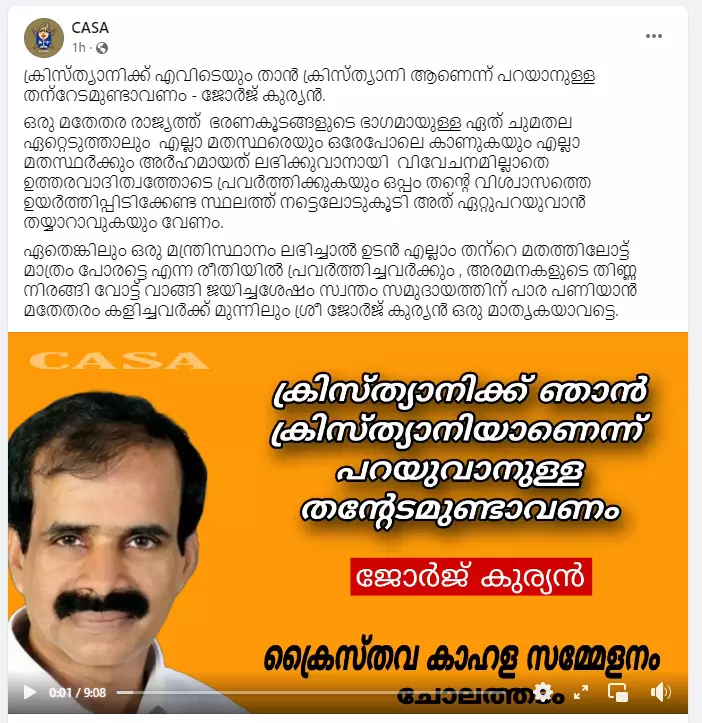സമുദായത്തിന് പാര പണിയാൻ മതേതരം കളിച്ചവർക്ക് മുന്നിൽ ജോർജ് കുര്യൻ മാതൃക - കാസ