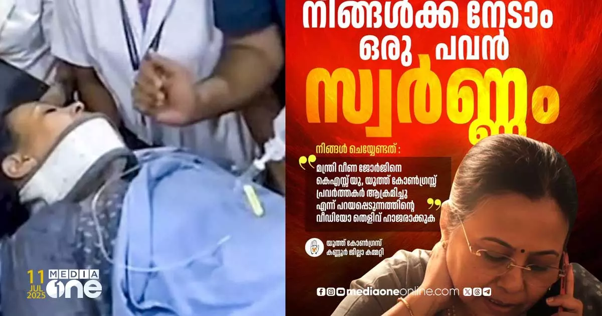വീണ ജോര്ജിനെ ആക്രമിക്കുന്നതിന്റെ വീഡിയോ തെളിവ് ഹാജരാക്കിയാൽ ഒരു പവൻ സ്വര്ണം; പാരിതോഷികം പ്രഖ്യാപിച്ച് യൂത്ത് കോൺഗ്രസ്