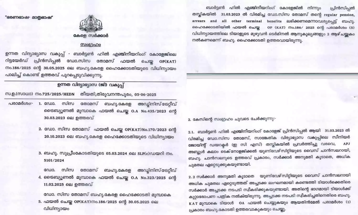 സിസ തോമസിന്റെ പെൻഷനടക്കമുള്ള ആനുകൂല്യങ്ങൾ അനുവദിച്ച് സർക്കാർ ഉത്തരവ്