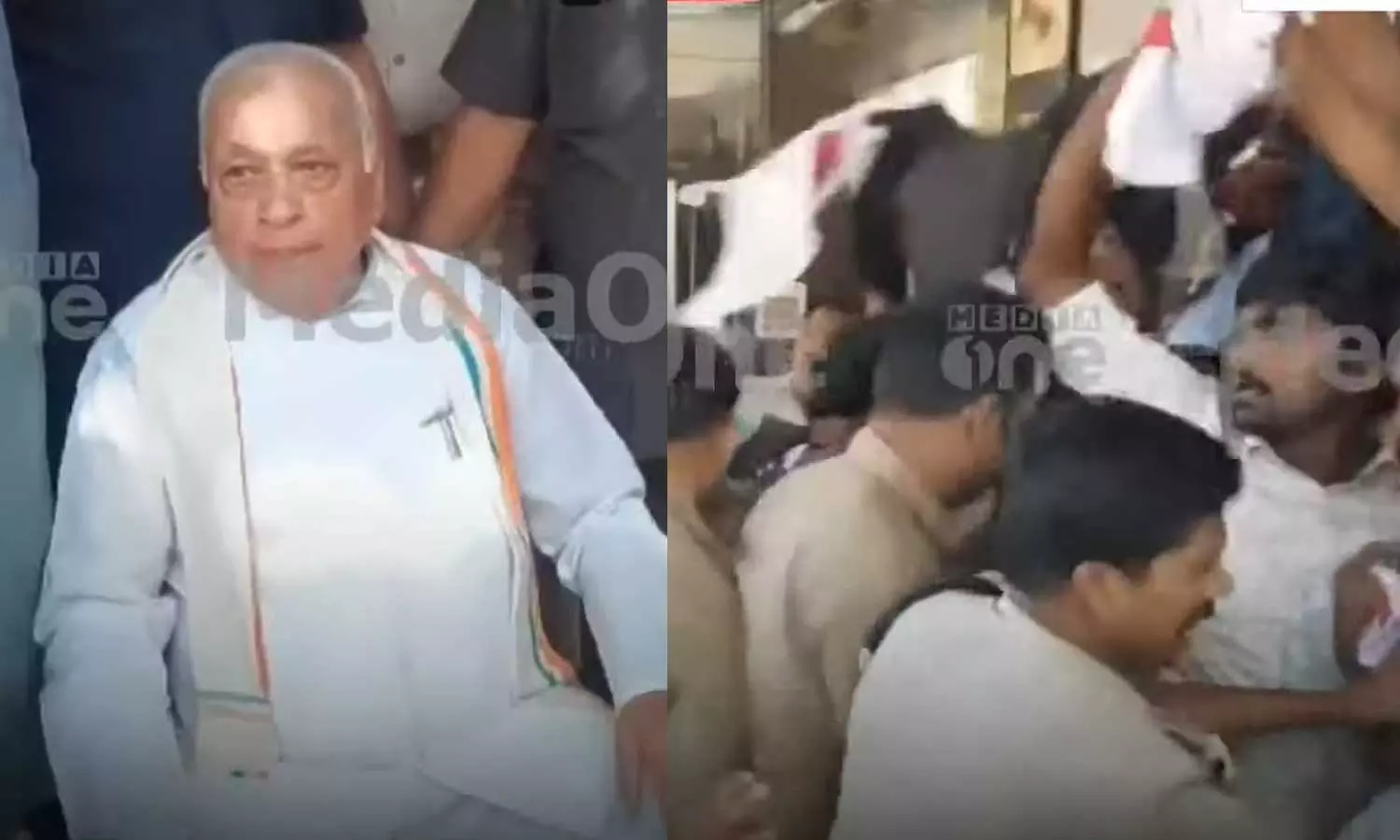 Summary: Governor Arif Mohammad Khan protests by sitting on a chair on the roadside in Kollam's Nilamel against the black flag protest of SFI.