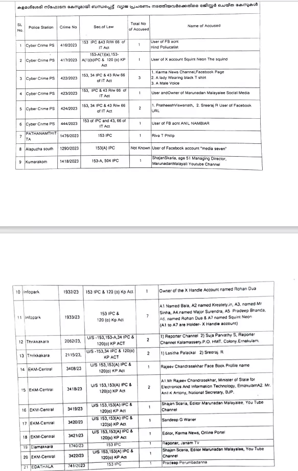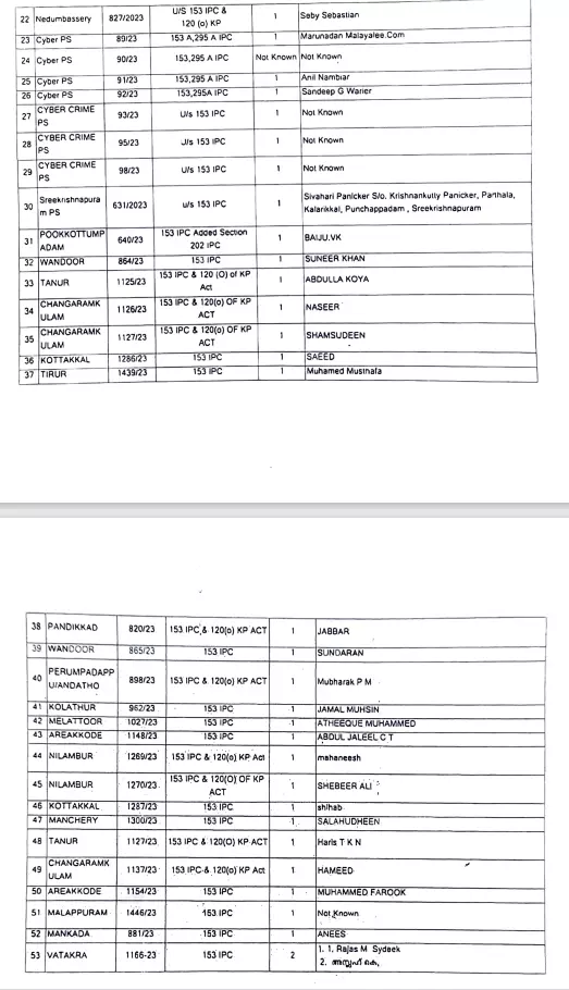 റിവ റ്റി ഫിലിപ്പ്, ആർ ശ്രീരാജ്,സിൻഹ, മേജർ സുരേന്ദ്ര, പ്രദീപ് ബാന്ദ്ര, റോഹൻ ദുഅ,സെബി സെബാസ്റ്റ്യൻ, ശിവഹരി പണിക്കർ, ബൈജു വി.കെ,റോഹൻ, ബാല, സുനീർ ഖാൻ, അബ്ദുല്ല കോയ, നസീർ, ഷംസുദ്ദീൻ, സഈദ്, മുഹമ്മദ് മുസ്തഫ, ജബ്ബാർ, സുന്ദരൻ, മുബാറക്, ജമാൽ മുഹ്സിൻ, അത്വീഖ് അഹമ്മദ്, അബ്ദുൽ ജലീൽ, മഹനീഷ്, ഷബീർ അലി, ഷിഹാബ്, സലാഹുദ്ദീൻ, ഹാരിസ്, ഹമീദ്, അനീസ്, രജാസ്, അസ്ലഹ്, hind poliucatist, Squint Neon the squint, മീഡിയ സെവൻ, kreately എന്നിവർക്കുമെതിരെ കേസ് എടുത്തിട്ടുണ്ട്.