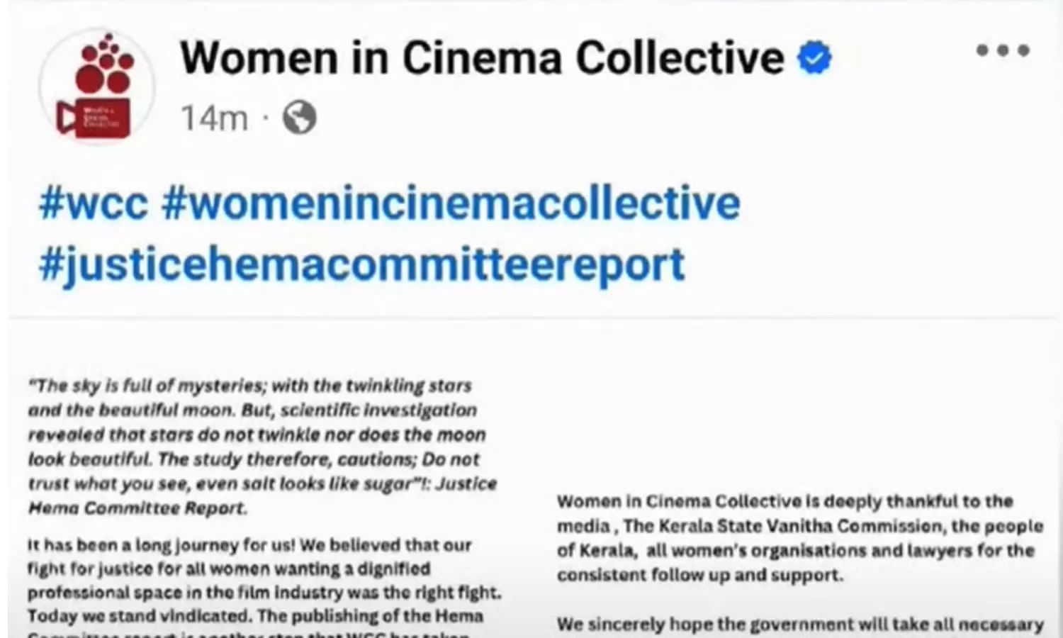 ഹേമ കമ്മിറ്റി റിപ്പോർട്ട്: പിന്തുണച്ച എല്ലാവർക്കും നന്ദി അറിയിച്ച് ഡബ്ല്യു.സി.സി