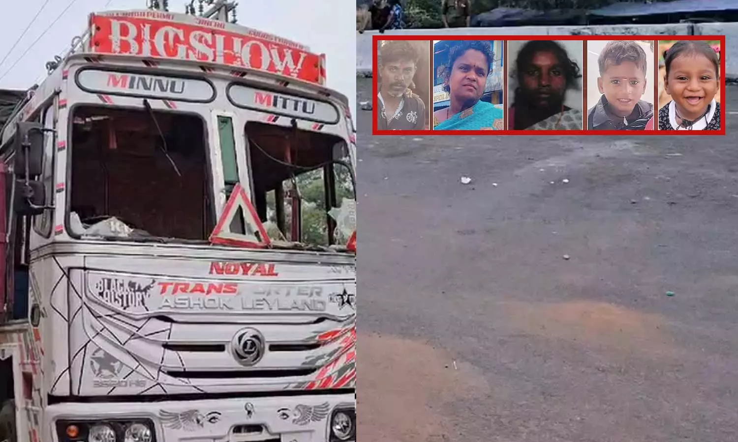 നവംബർ 26ന് പുലര്ച്ചെയായിരുന്നു അപകടം. പാലക്കാട് ഗോവിന്ദാപുരം ചെമ്മണംതോട് സ്വദേശികളായ കാളിയപ്പന് (50), നാഗമ്മ (39), ബംഗാഴി (20), ജീവന് (4), മറ്റൊരു കുട്ടി എന്നിവരാണ് മരിച്ചത്. അപകടത്തിന് ശേഷം വാഹനം നിർത്താതെ പോയ ഇവരെ നാട്ടുകാരാണ് പിടികൂടിയത്. ക്ലീനർ അലക്സിന് ഡ്രൈവിങ് ലൈസൻസില്ലെന്ന് പൊലീസ് അറിയിച്ചിരുന്നു.