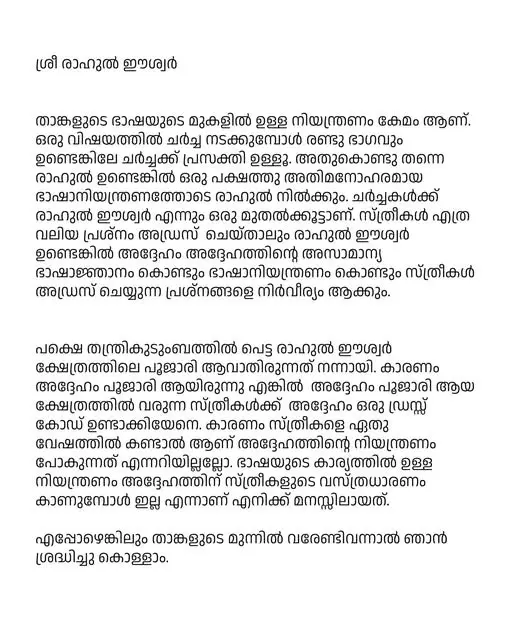 "സ്ത്രീകൾ എത്ര വലിയ പ്രശ്നം അഡ്രസ് ചെയ്താലും രാഹുൽ ഈശ്വർ ഉണ്ടെങ്കിൽ അദ്ദേഹം, അദ്ദേഹത്തിന്റെ അസാമാന്യ ഭാഷാജ്ഞാനം കൊണ്ടും ഭാഷാനിയന്ത്രണം കൊണ്ടും സ്ത്രീകൾ അഡ്രസ് ചെയ്യുന്ന പ്രശ്നങ്ങളെ നിർവീര്യം ആക്കും. തന്ത്രി കുടുംബത്തിൽപ്പെട്ട രാഹുൽ പൂജാരി ആകാതിരുന്നത് നന്നായി. തന്ത്രിയായിരുന്നുവെങ്കിൽ ക്ഷേത്രത്തിൽ വരുന്ന സ്ത്രീകൾക്ക് രാഹുൽ ഡ്രസ്സ് കോഡ് ഉണ്ടാക്കിയേനെ. സ്ത്രീകളെ ഏതു വേഷത്തിൽ കണ്ടാലാണ് രാഹുലിന് നിയന്ത്രണം പോകുന്നതെന്ന് അറിയില്ല. ഭാഷയുടെ കാര്യത്തിലുള്ള നിയന്ത്രണം സ്ത്രീകളുടെ വസ്ത്രധാരണം കാണുമ്പോൾ രാഹുലിനില്ല." ഹണി പോസ്റ്റിൽ വ്യക്തമാക്കി.
