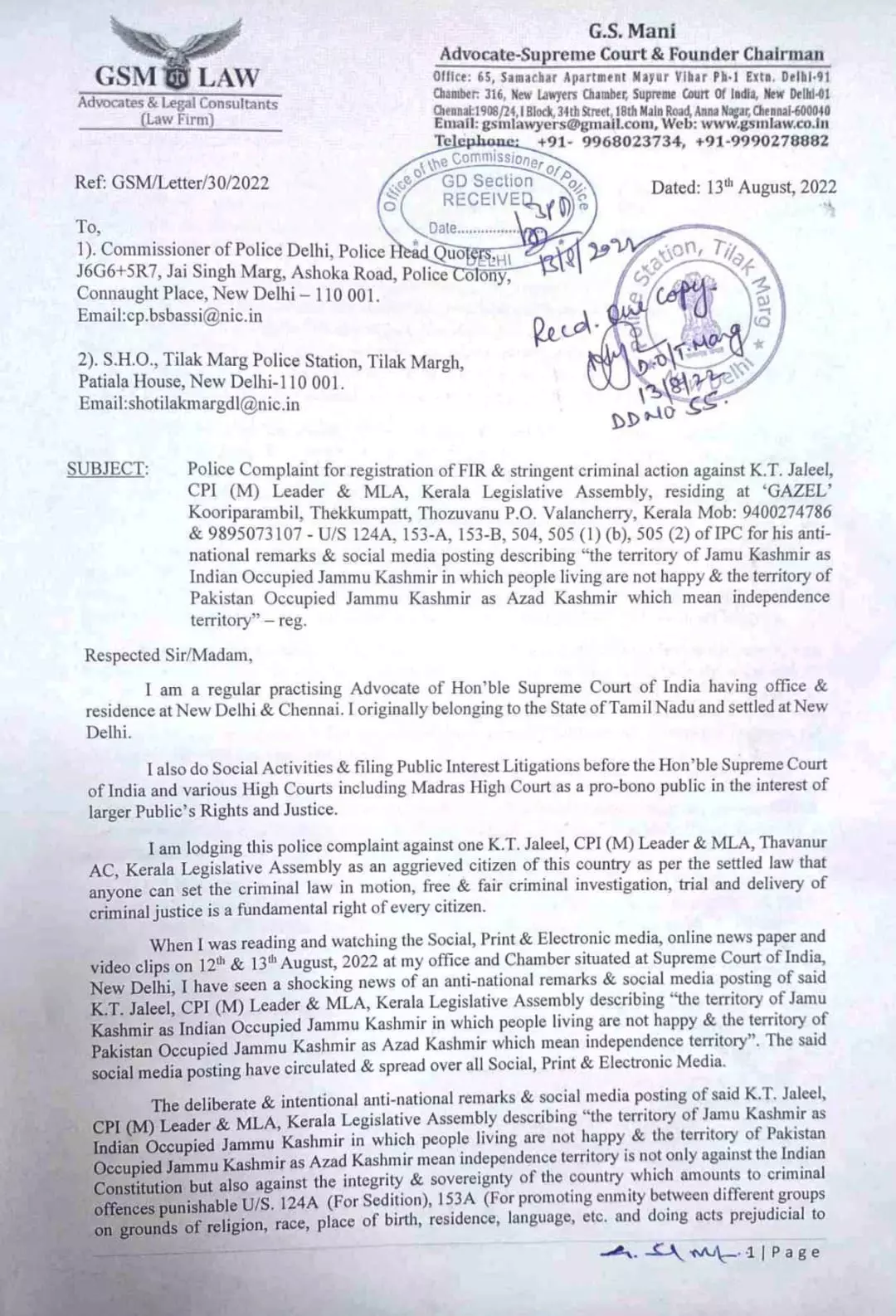 ഡൽഹി തിലക് മാർഗ് പൊലീസ് സ്റ്റേഷനിലാണ് അഡ്വ. ജി.എസ്. മണി പരാതി നൽകിയത്. കെ.ടി ജലീൽ ഫേസ്ബുക്ക് പോസ്റ്റ് പിൻവലിച്ചത് കൊണ്ട് പരാതി പിൻവലിക്കില്ലെന്നു പരാതിക്കാരൻ നേരത്തെ വ്യക്തമാക്കിയിരുന്നു. പരാതി നൽകിയത് പോസ്റ്റ് പിൻവലിക്കാനല്ലെന്നും കെടി ജലീലിനെ പ്രോസിക്യൂട്ട് ചെയ്യാനാണെന്നും അദ്ദേഹം പറഞ്ഞു. വിവാദ പരാമർശമുള്ള പോസ്റ്റ് പിൻവലിച്ചതായി ജലീൽ എഫ്.ബിയിലൂടെ തന്നെ അറിയിച്ചിരുന്നു. ഇതിനെ തുടർന്നാണ് പരാതിയിൽ നിന്ന് പിറകോട്ട് പോകില്ലെന്ന് മണി പറഞ്ഞത്.