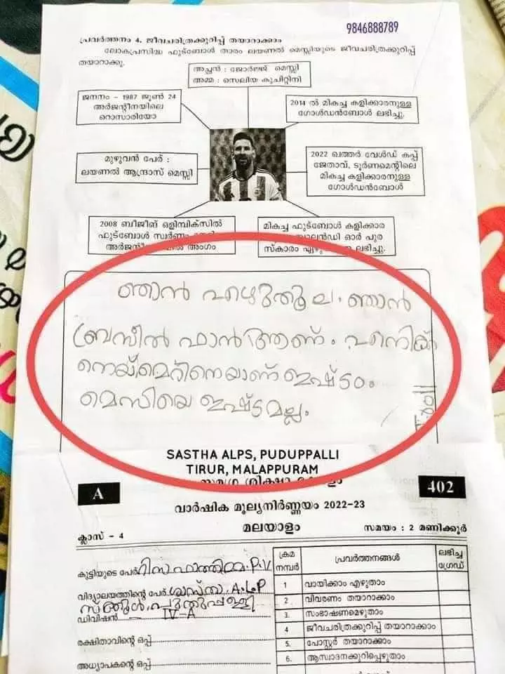 ഞാൻ ബ്രസീൽ ഫാനാണെന്നും എനിക്ക് നെയ്മറിനെയാണ് ഇഷ്ടമെന്നും മെസിയെ ഇഷ്ടമല്ലെന്നുമാണ് ഈ ചോദ്യത്തിന് താഴെയായി വിദ്യാർഥി എഴുതിയത്. മലപ്പുറം ജില്ലയിലെ തിരൂർ പുതുപ്പള്ളി ശാസ്ത എൽ.പി സ്കൂളിലെ ചോദ്യപേപ്പറാണ് പ്രചരിക്കുന്നത്. റിസ ഫാത്തിമ പി.വിയാണ് ഇങ്ങനെയൊരു ഉത്തരം നൽകിയിരിക്കുന്നത്. സത്യമെന്തെന്ന് അറിയാൻ സ്കൂൾ അധികൃതരെ ബന്ധപ്പെട്ടപ്പോൾ അവർ ഇക്കാര്യ സ്ഥിരീകരിച്ചു. വിദ്യാർഥി ഇങ്ങനെയൊരു ഉത്തരം എഴുതിയത് ശ്രദ്ധയിൽപെടുകയും പിന്നീടത് തിരുത്താൻ ആവശ്യപ്പെടുകയും ചെയ്തെന്ന് സ്കൂളിലെ മലയാളം നാലാം ക്ലാസ് അദ്ധ്യപകന് റിഫ ഷെലീസ് മീഡിയവണ് വെബിനോട് വ്യക്തമാക്കി.
