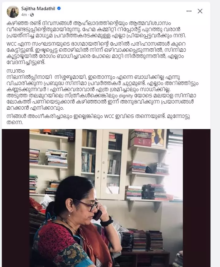 ഹേമ കമ്മിറ്റി റിപ്പോർട്ട്; എല്ലാമറിഞ്ഞിട്ടും സ്വന്തം നിലനിൽപ്പിനായി കണ്ണടക്കുന്ന പ്രബുദ്ധ സിനിമാ പ്രവർത്തകർ ചുറ്റമുണ്ടെന്ന് സജിത മഠത്തിൽ