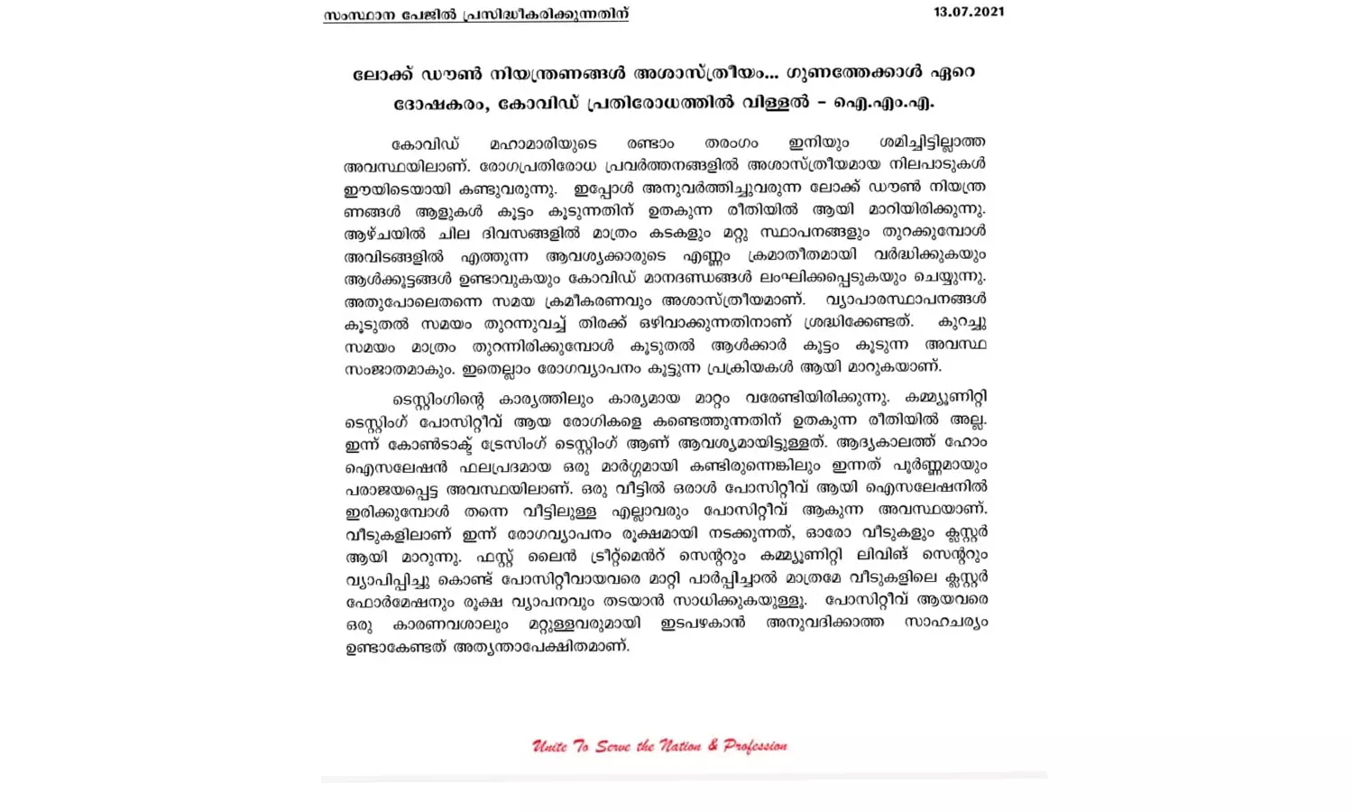 ലോക്ക്ഡൗണ് നയം ശാസ്ത്രീയമായി പുനരാവിഷ്കരിക്കണണം. ശക്തമായ ബോധവല്ക്കരണത്തിലൂടെ കോവിഡ് മാനദണ്ഡങ്ങള് പാലിക്കാന് ജനങ്ങളെ സജ്ജരാക്കേണ്ട ചുമതല സര്ക്കാരും പൊതുസമൂഹവും ഏറ്റെടുത്തേ മതിയാകൂ. ദീര്ഘകാലാടിസ്ഥാനത്തിലുള്ള പ്ലാനിങ്ങും നിയന്ത്രണങ്ങളും ആണ് ഇനി വേണ്ടത്. കൊവിഡ് മഹാമാരി അടുത്ത ഒന്നോ രണ്ടോ വര്ഷം കൂടെ തുടര്ന്നു പോകും, അതുകൊണ്ടുതന്നെ ഈ സാഹചര്യത്തെ മറികടക്കുന്നതിനുള്ള മാര്ഗ്ഗങ്ങള് ദീര്ഘകാലാടിസ്ഥാനത്തില് തന്നെ വേണമെന്നും ഐ.എം.എ പറയുന്നു.