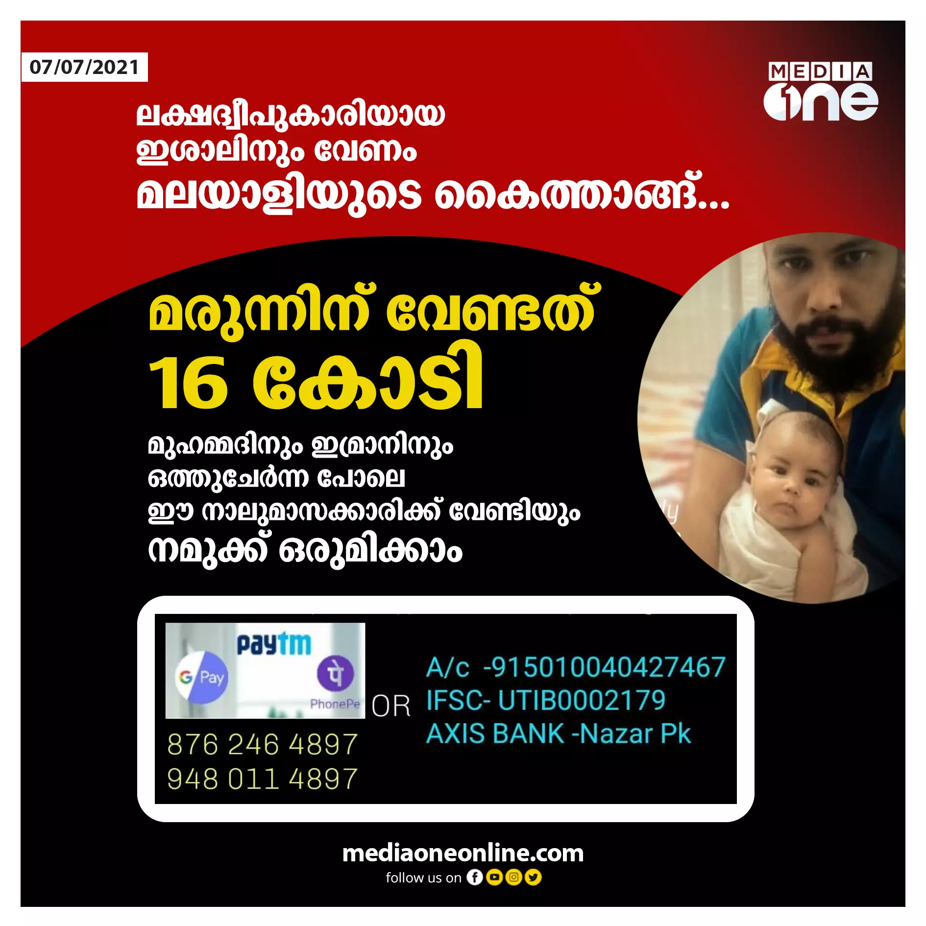 നാലുമാസം മാത്രം പ്രായം, മരുന്നിന് വേണ്ടത് 16 കോടി; ലക്ഷദ്വീപുകാരിയായ ഇശാലിനും വേണം മലയാളിയുടെ കൈത്താങ്ങ്