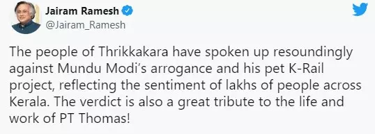 |മുഖ്യമന്ത്രിയുടെ സ്വപ്ന പദ്ധതിയായ കെ റെയിലിനും ഏറ്റ കനത്ത തിരിച്ചടിയാണ് തൃക്കാക്കരയിലെ യുഡിഎഫിന്റെ തേരോട്ടമെന്ന് ജയ്റാം രമേശ് ട്വീറ്റിൽ കുറിച്ചു