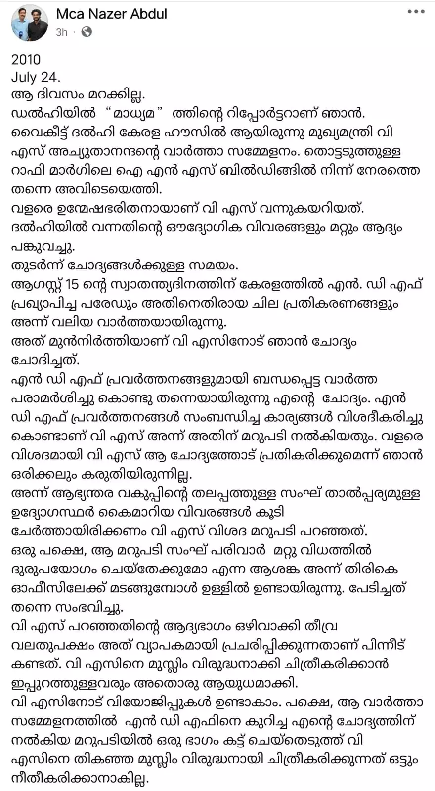 വി എസിനോട് വിയോജിപ്പുകൾ ഉണ്ടാകാം. പക്ഷെ, ആ വാർത്താ സമ്മേളനത്തിൽ എൻ ഡി എഫിനെ കുറിച്ച എന്റെ ചോദ്യത്തിന് നൽകിയ മറുപടിയിൽ ഒരു ഭാഗം കട്ട് ചെയ്തെടുത്ത് വി എസിനെ തികഞ്ഞ മുസ്ലിം വിരുദ്ധനായി ചിത്രീകരിക്കുന്നത് ഒട്ടും