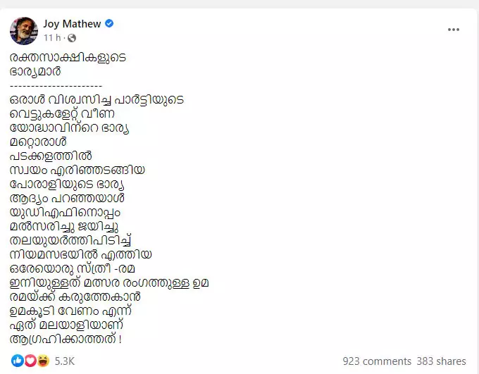 രമ വിശ്വസിച്ച പാർട്ടിയുടെ വെട്ടുകളേറ്റ് വീണ യോദ്ധാവിന്റെ ഭാര്യയാണെന്നും ഉമ പടക്കളത്തിൽ സ്വയം എരിഞ്ഞടങ്ങിയ പോരാളിയുടെ ഭാര്യയാണെന്നും ജോയ് മാത്യു പറഞ്ഞു. രമയ്ക്ക് കരുത്തേകാൻ ഉമകൂടി വേണം എന്ന് ഏത് മലയാളിയാണ് ആഗ്രഹിക്കാത്തതെന്നും ജോയ് മാത്യു കുറിച്ചു.