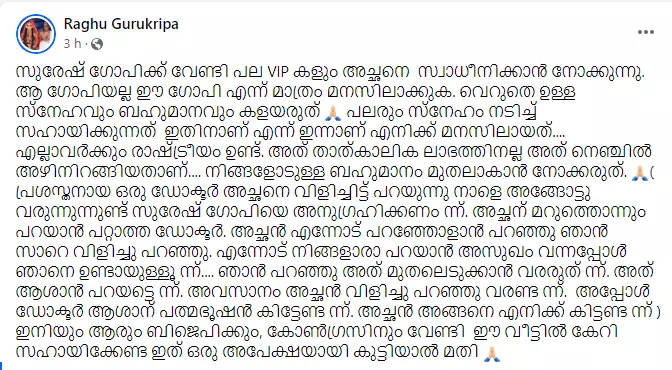 സുരേഷ് ഗോപിക്ക് വേണ്ടി പല വി.ഐപികളും അച്ഛനെ സ്വാധീനിക്കാൻ നോക്കുന്നു.ആ ഗോപിയല്ല ഈ ഗോപി എന്ന് മാത്രം മനസിലാക്കുക. വെറുതെ ഉള്ള സ്നേഹവും ബഹുമാനവും കളയരുത്. പലരും സ്നേഹം നടിച്ച് സഹായിക്കുന്നത് ഇതിനാണ് എന്ന് ഇന്നാണ് എനിക്ക് മനസിലായത്.എല്ലാവർക്കും രാഷ്ട്രീയം ഉണ്ട്. അത് താത്കാലിക ലാഭത്തിനല്ല അത് നെഞ്ചിൽ ആഴ്ന്നിറങ്ങിയതാണ്.നിങ്ങളോടുള്ള ബഹുമാനം മുതലാക്കാൻ നോക്കരുത്.( പ്രശസ്തനായ ഒരു ഡോക്ടർ അച്ഛനെ വിളിച്ചിട്ട് പറയുന്നു നാളെ അങ്ങോട്ടു വരുന്നുന്നുണ്ട് സുരേഷ് ഗോപിയെ അനുഗ്രഹിക്കണമെനന്ന്. അച്ഛന് മറുത്തൊന്നും പറയാൻ പറ്റാത്ത ഡോക്ടർ. അച്ഛൻ എന്നോട് പറഞ്ഞോളാൻ പറഞ്ഞു ഞാൻ സാറെ വിളിച്ചു പറഞ്ഞു.എന്നോട് നിങ്ങളാരാ പറയാൻ അസുഖം വന്നപ്പോൾ ഞാനെ ഉണ്ടായുള്ളൂന്ന്.ഞാൻ പറഞ്ഞു അത് മുതലെടുക്കാൻ വരരുതെന്ന്.അത് ആശാൻ പറയട്ടെന്ന്. അവസാനം അച്ഛൻ വിളിച്ചു പറഞ്ഞു വരണ്ടെന്ന്. അപ്പോൾ ഡോക്ടർ ആശാന് പത്മഭൂഷൺ കിട്ടണ്ടേന്ന്.അച്ഛൻ അങ്ങനെ എനിക്ക് കിട്ടണ്ടെന്ന്) ഇനിയും ആരും ബിജെപിക്കും, കോൺഗ്രസിനും വേണ്ടി ഈ വീട്ടിൽ കേറി സഹായിക്കേണ്ട ഇത് ഒരു അപേക്ഷയായി കുട്ടിയാൽ മതി