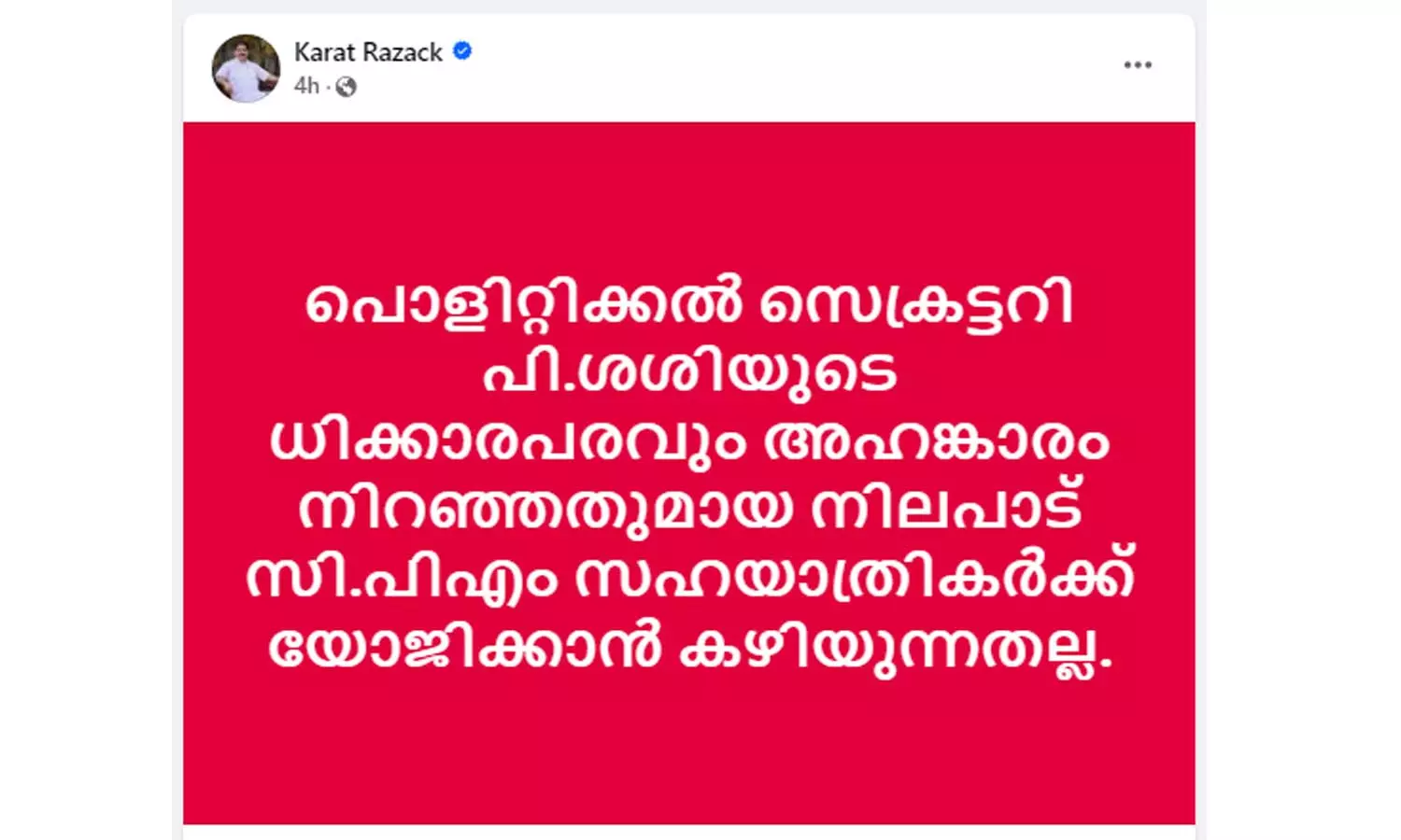 കോഴിക്കോട്: മുഖ്യമന്ത്രിയുടെ പൊളിറ്റിക്കൽ സെക്രട്ടറി പി. ശശിക്കെതിരെ എൽഡിഎഫ് മുൻ എംഎൽഎ കാരാട്ട് റസാഖ്. 'പൊളിറ്റിക്കൽ സെക്രട്ടറി പി. ശശിയുടെ ധിക്കാരപരവും അഹങ്കാരം നിറഞ്ഞതുമായ നിലപാട് സിപിഎം സഹയാത്രികർക്ക് യോജിക്കാൻ കഴിയുന്നതല്ല'- എന്ന് റസാഖ് ഫേസ്ബുക്കിൽ കുറിച്ചു.