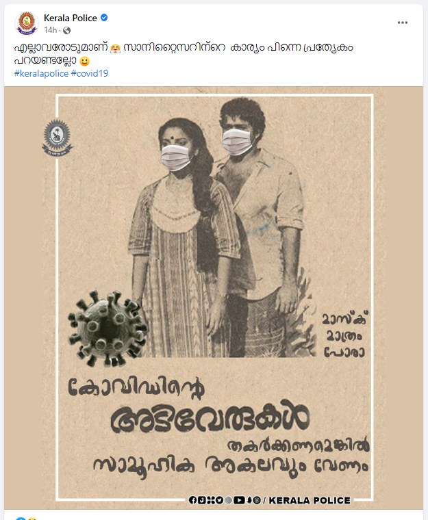 1986ൽ റിലീസ് ചെയ്ത അടിവേരുകൾ എന്ന മോഹൻലാൽ ചിത്രത്തിന്റെ പോസ്റ്റർ എഡിറ്റ് ചെയ്താണ് പോസ്റ്റ് ഉണ്ടാക്കിയിട്ടുള്ളത്. ലാലും ചിത്രത്തിലെ നായിക കാർത്തികയും മാസ്ക് ധരിച്ചാണ് നിൽക്കുന്നത്. മാക്സ് മാത്രം പോര, കോവിഡിന്റെ അടിവേരുകൾ തകർക്കണമെങ്കിൽ സാമൂഹിക അകലവും വേണം എന്ന് പോസ്റ്ററിൽ എഴുതിയിട്ടുണ്ട്. സാനിറ്റൈസറിന്റെ കാര്യം പിന്നെ പ്രത്യേകം പറയേണ്ടല്ലോ എന്ന് തലവാചകവും നൽകിയിട്ടുണ്ട്.