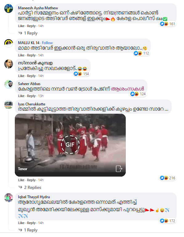 'പാർട്ടി സമ്മേളനം ഒന്ന് കഴിഞ്ഞോട്ടെ, നിയന്ത്രണങ്ങൾ കൊണ്ട് ജനങ്ങളുടെ അടിവേര് ഞങ്ങള് ഇളക്കും', 'തിരുവാതിര കളിക്കാൻ പോയാൽ കൊഴപ്പമുണ്ടോ..ക്രിക്കറ്റ് കളിച്ചവന്മാരെ ഒക്കെ തല്ലി ഓടിച്ചത് അല്ലെ...', 'കല്യാണക്കുറിയിൽ തിരുവാതിര എന്നെഴുതിയാൽ ഓക്കേ ആവുമോ സാറേ ?' -എന്നിങ്ങനെ പോകുന്നു വിമർശനങ്ങൾ.