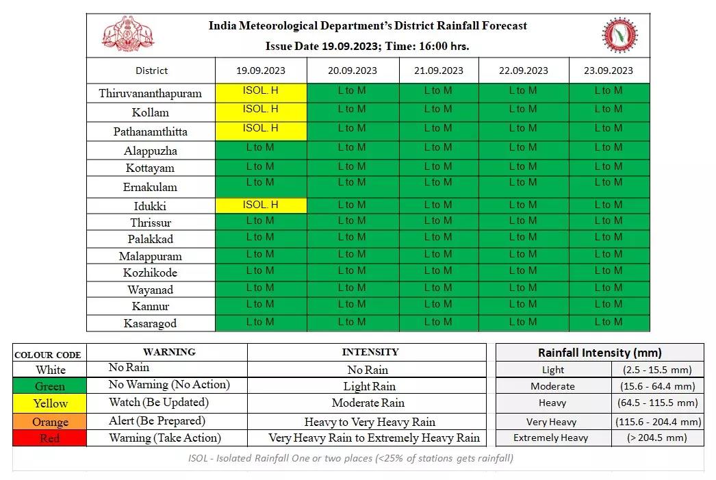 ഒറ്റപ്പെട്ട ശക്തമായ മഴയ്ക്കുള്ള സാധ്യതയാണ് പ്രവചിക്കപ്പെട്ടിരിക്കുന്നത്. 24 മണിക്കൂറിൽ 64.5 മില്ലിമീറ്റർ മുതൽ 115.5 മില്ലിമീറ്റർ വരെ മഴ ലഭിക്കുന്ന സാഹചര്യത്തെയാണ് ശക്തമായ മഴ എന്നത് കൊണ്ട് അർത്ഥമാക്കുന്നത്.