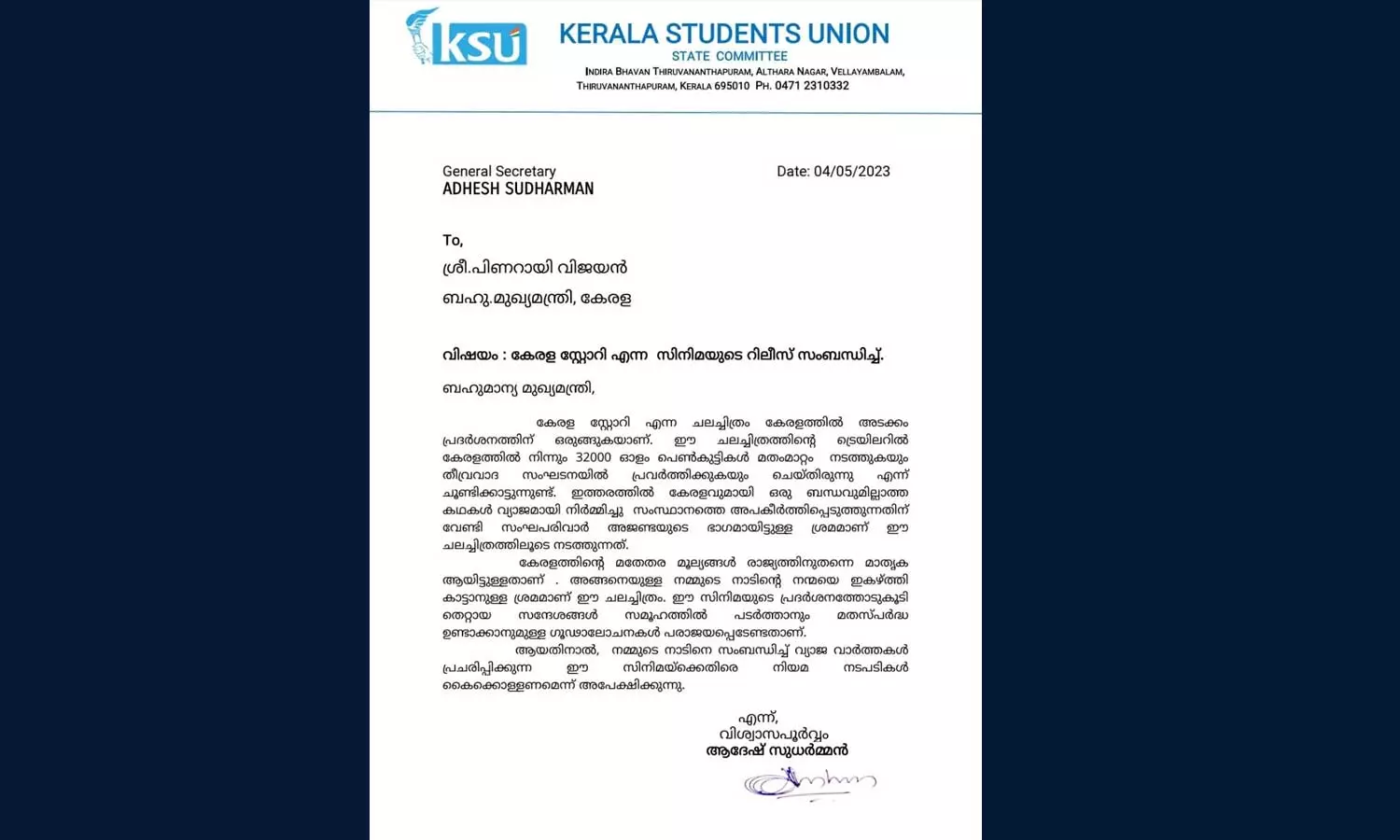'കേരള സ്റ്റോറിക്കെതിരെ നിയമനടപടി സ്വീകരിക്കണം'; മുഖ്യമന്ത്രിക്ക് പരാതി നൽകി കെ.എസ്.യു
