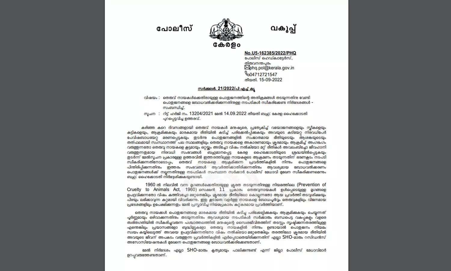 തെരുവ് നായകൾ പൊതുജനങ്ങളെ മാരകമായ രീതിയിൽ കടിച്ച് പരിക്കേല്പ്പിക്കുകയും ആക്രമിക്കുകയും ചെയ്യുന്നത് പൂർണമായും ഒഴിവാക്കുന്നതിനാവശ്യമായ നടപടികൾ സർക്കാരും ബന്ധപ്പെട്ട വകുപ്പുകളും ത്വരിതഗതിയിൽ തന്നെ സ്വീകരിച്ചു വരുന്ന സാഹചര്യത്തിൽ പൗരന്മാർ നിയമം കയ്യിലെടുക്കരുതെന്ന് ഡിജിപി സർക്കുലറിൽ അറിയിച്ചു.
