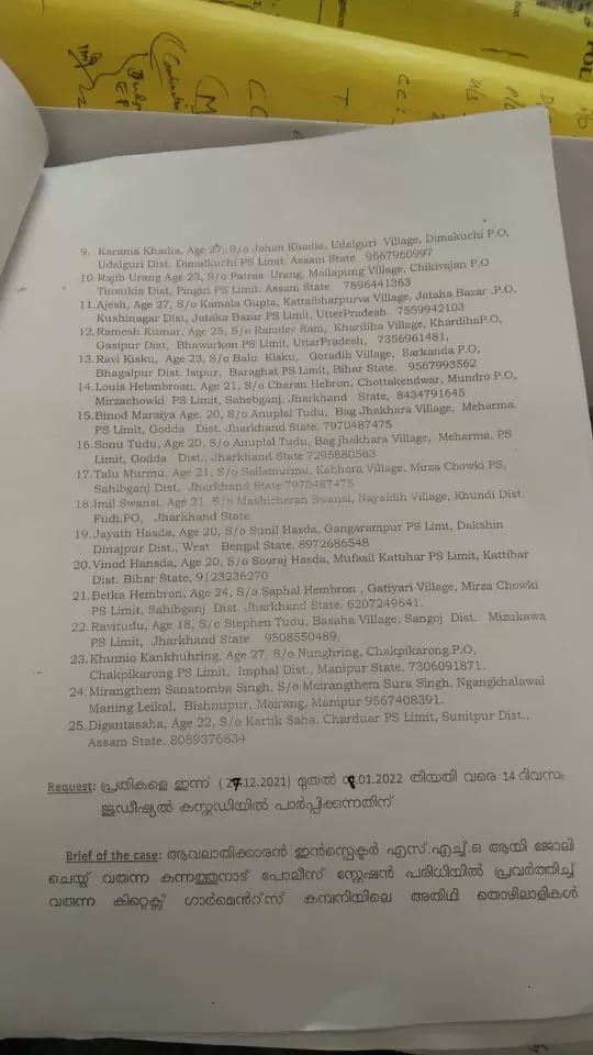 മണിപ്പൂർ ബിഷ്ണു പൂർ മോറങ്ങ് പൊലീസ് സ്റ്റേഷൻ പരിധിയിൽ ടി.എച്ച് ഗുൽഷൻ സിങ്ങ്, ചുരച്ചൻ പൂർ മോയിഗങ്ങ് പൊലീസ് സ്റ്റേഷൻ പരിധിയിൽ സെർട്ടോ ഹെൻജാക്കുപ്കോൻ, മോയി രംഗ പൊലീസ് സ്റ്റേഷൻ പരിധിയിൽ ഗാങ്ങ്സാലുവായ് വില്ലേജിൽ മൈരമ്പാംബോയിച്ചാ സിങ്ങ്, അസം സ്വദേശി കൊക്രജാർ ഡിങ്കഡിങ്ക വില്ലേജിൽ അഷിംറോയി, കർവിലങ്ങോങ്ങ് പണ്ടുരി മേഘ വില്ലേജിൽ ബിദാസേങ്ങ് കോലാർ, ടിൻസുക്കിയ ഫിലോപുരി വില്ലേജിൽ ഏലിയാസ് ബറുവ, ബുദൽ പാറ വില്ലേജിൽ പൗലുഷ് കാൽക്കോ, ചന്ദ്രപ്പൂർ വില്ലേജിൽ കെലോൺ മരാക്ക്, ഉദൽ ഗിരി വില്ലേജിൽ ജോൺ കാദിയ മകൻ കരാമ കാദിയ, മൊയിലാ പുങ്ങ് വില്ലേജിൽ പത്രോസ് ഉരങ്ങിന്റെ മകൻ റജിബ് ഉരങ്ങ്, യു.പി കുശി നഗർ ജില്ലയിലെ കട്ടായി ബാർ പൂർവ വില്ലേജിൽ അജേഷ്, കർദിഹാ വില്ലേജിൽ രമേശ് കുമാർ, ബിഹാർ ഗോരാദി വില്ലേജിൽ രവി കിസ്കു, ജാർഖണ്ഡ് മിർസാ ചൗക്കി പൊലീസ് സ്റ്റേഷൻ പരിധിയിൽ ലൂയിസ് ഹെംറോൻ, മെഹർമ പൊലീസ് സ്റ്റേഷൻ പരിധിയിൽ ബിനോദ് മര്യ, സോനുറ്റുഡു, മിർസാ ചൗക്കി പൊലീസ് സ്റ്റേഷൻ പരിധിയിൽ ടാലു മർമു, ഖുണ്ടി ജില്ലയിൽ ഇമിൽ സാൻസി, വെ. ബംഗാൾ ദിനാജ് പൂർ ജില്ലയിൽ സുനിൽ ഹസ്ദ മകൻ ജയന്ത് ഹസ്ദ, കട്ടി ഹാർ ജില്ലയിൽ വിനോദ് ഹൻസ്ദ, ജാർഖണ്ഡ് മിർസാ ചൗക്ക് പൊലീസ് സ്റ്റേഷൻ പരിധിയിൽ ബെറ്റക്ക ഹെബ്രോൺ, രവിറ്റുഡു, മണിപ്പൂർ ചക്ക്പി ച രോങ്ങ് കുമിയോ കാൻ ക്രുങ്ങ്, മരിങ്ങ്ടേം സനാടോമ്പ സിങ്ങ്, അസം സ്വദേശി ദിഗന്ത സാഹ എന്നിവരാണ് റിമാൻഡിലായത്.