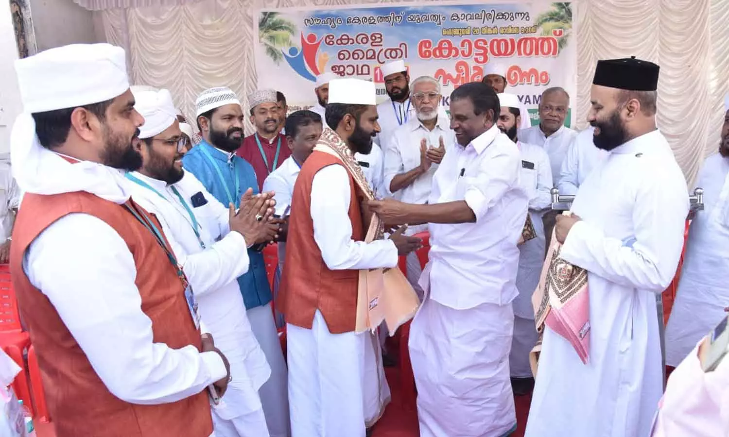 കോട്ടയം: 'സൗഹൃദ കേരളത്തിന് യുവത്വം കാവലിരിക്കുന്നു' എന്ന പ്രമേയത്തിൽ കെ.എം.വൈ.എഫ് സംസ്ഥാന കമ്മിറ്റി സംഘടിപ്പിക്കുന്ന കേരള മൈത്രി ജാഥ കോട്ടയം ജില്ലയിൽ പര്യടനം ആരംഭിച്ചു. കോട്ടയത്ത് നടന്ന സ്വീകരണ സമ്മേളനത്തിൽ ജാഥാ ക്യാപ്റ്റൻ ഇലവുപാലം ഷംസുദ്ദീൻ മന്നാനിയെ സി.എസ്.ഐ മധ്യകേരള മഹായിടവക ബിഷപ്പ് ഡോ:മലയിൽ സാബു കോശി ചെറിയാൻ, കോട്ടയം എം.എൽ.എ തിരുവഞ്ചൂർ രാധാകൃഷ്ണൻ, ഫാദർ മോസ് ജോസഫ് എന്നിവർ ചേർന്ന് സ്വീകരിച്ചു. ഫെബ്രുവരി 17 ന് കൊടുങ്ങല്ലൂരിൽനിന്നാണ് ജാഥ ആരംഭിച്ചത്. ഈ മാസം 25 ന് തിരുവനന്തപുരത്ത് സമാപിക്കും.