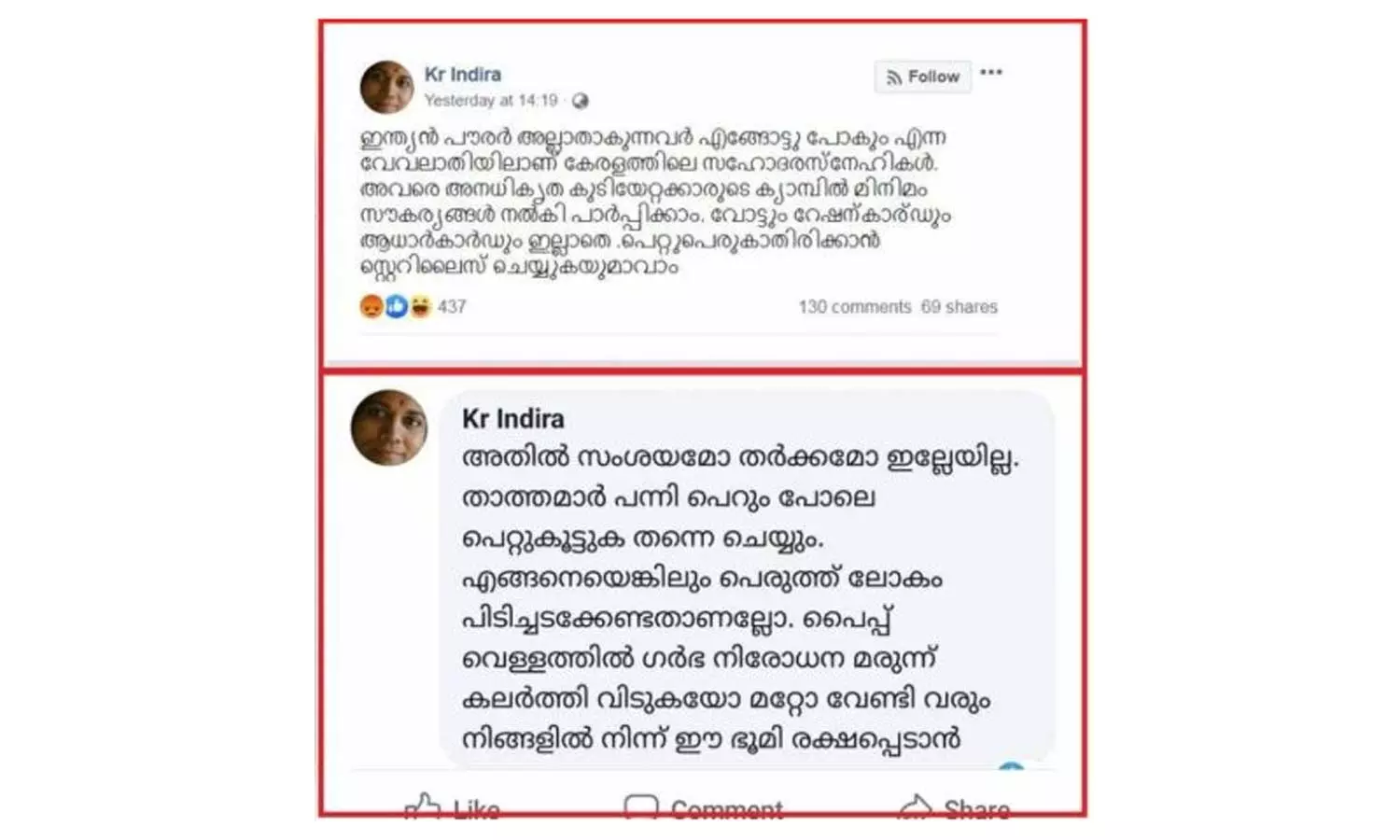 'ഇന്ത്യൻ പൗരർ അല്ലാതാകുന്നവർ എങ്ങോട്ട് പോകും എന്ന വേവലാതിയിലാണ് കേരളത്തിലെ സഹോദര സ്നേഹികൾ. അവരെ അനധികൃത കുടുയേറ്റക്കാരുടെ ക്യാമ്പിൽ മിനിമം സൗകര്യങ്ങൾ നൽകി പാർപ്പിക്കാം. വോട്ടും, റേഷൻ കാർഡും ആധാർ കാർഡും ഇല്ലാതെ പെറ്റുപെരുകാതിരിക്കാൻ സ്റ്റെറിലൈസ് ചെയ്യുകയുമാവാം ‘എന്ന ഇവരുടെ തന്നെ പോസ്റ്റിന് താഴെയായിരുന്നു വിദ്വേഷ കമന്റ്. അസമിലെ ദേശീയ പൗരത്വ പട്ടികയില് നിന്ന് 19 ലക്ഷം പേര് പുറത്തായത് സംബന്ധിച്ചായിരുന്നു ഈ പോസ്റ്റ്.