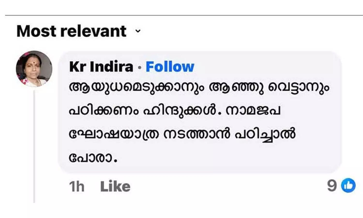 |'ആയുധമെടുക്കാനും ആഞ്ഞുവെട്ടാനും ഹിന്ദുക്കൾ പഠിക്കണം, നാമജപ ഘോഷയാത്ര നടത്താൻ മാത്രം പഠിച്ചാൽ പോരാ' എന്നാണ് കെ.ആർ ഇന്ദിരയുടെ പരാമർശം.