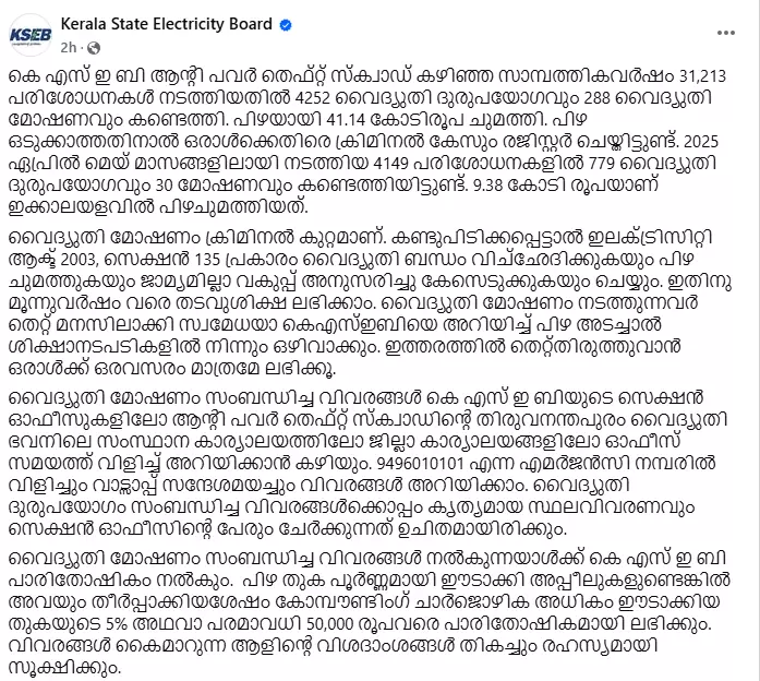 വൈദ്യുതി മോഷ്ടിച്ചതിന് കഴിഞ്ഞ സാമ്പത്തിക വർഷം 41 കോടി പിഴ ചുമത്തിയതായി കെ എസ് ഇ ബി